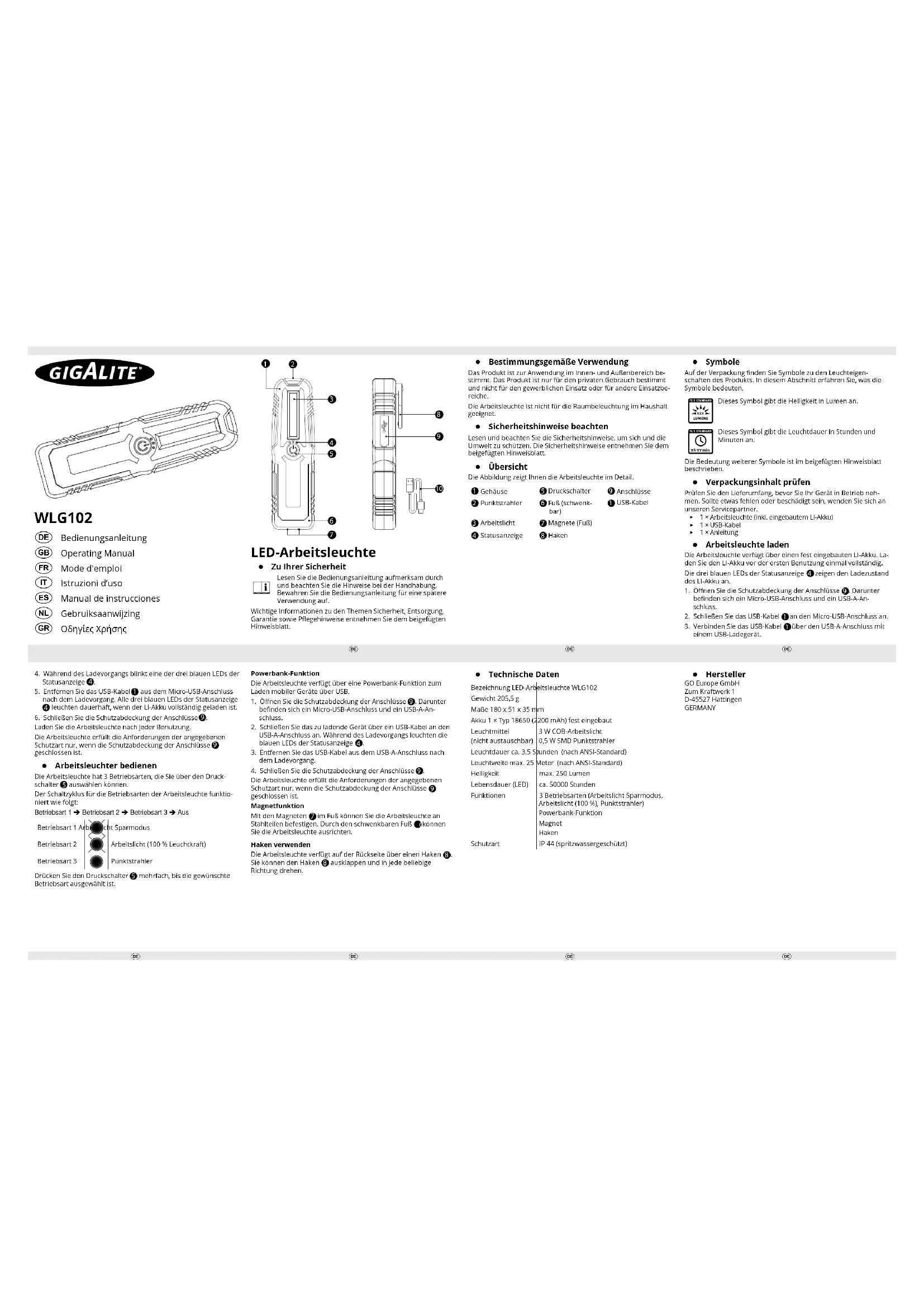 et le faire pivoter dans une direction quelconque. ▯ Données techniques Désignation Lampe de travail à éclairage LED WLG102 Poids 205,5 g Dimensions 180 x 51 x 35 mm Accu 1 Type 18650 ( 2200 mAh) intégré Source d'éclairage (non interchan- geable) Éclairage de travail COB 3W Projecteur à faisceau étroit 0,5W SMD Autonomie env. 3,5 heures (selon la norme ANSI) Portée d'éclairage max. 25 mètres (selon la norme ANSI) Luminosité max. 250 lumens Durée de vie (LED) env. 50 000 heures Fonctions 3 Modes (Éclairage de travail mode écono- mie, éclairage de travail (100%), projec- teur à faisceau étroit) Fonction PowerBank Aimant Crochet Type de protection IP 44 (étanche aux projections d'eau) ▯ Fabricant GO Europe GmbH Zum Kraftwerk 1 D-45527 Hattingen ALLEMAGNE
