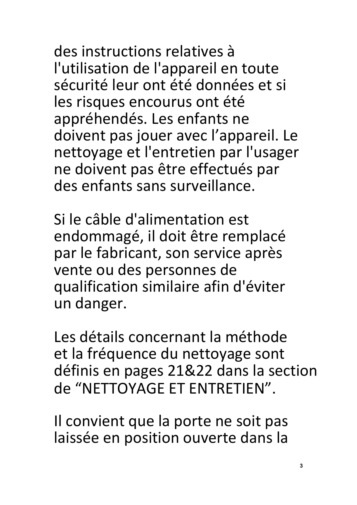 des instructions relatives à l'utilisation de l'appareil en toute sécurité leur ont été données et si les risques encourus ont été appréhendés. Les enfants ne doivent pas jouer avec l’appareil. Le nettoyage et l'entretien par l'usager ne doivent pas être effectués par des enfants sans surveillance. Si le câble d'alimentation est endommagé, il doit être remplacé par le fabricant, son service après vente ou des personnes de qualification similaire afin d'éviter un danger. Les détails concernant la méthode et la fréquence du nettoyage sont définis en pages 21&22 dans la section de “NETTOYAGE ET ENTRETIEN”. Il convient que la porte ne soit pas laissée en position ouverte dans la
