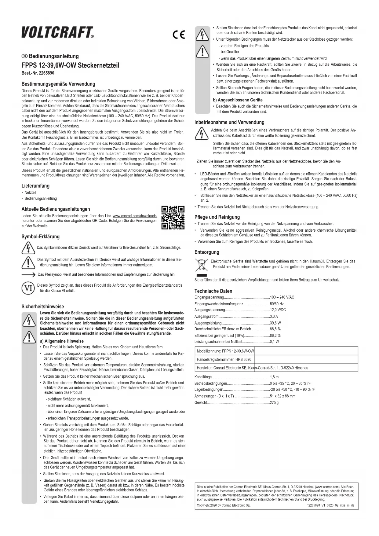 - Nettoyez le produit avec un chiffon sec et sans bres. Élimination des déchets Les appareils électroniques sont des matériaux recyclables et ne doivent pas être éliminés avec les ordures ménagères. En n de vie, éliminez l’appareil conformément aux dispositions légales en vigueur. Ainsi, vous respectez les ordonnances légales et contribuez à la protection de l’environnement. Données techniques Tension d’entrée ....................................................100 – 240 V/CA Fréquence du CA d’entrée .....................................50/60 Hz Tension de sortie ...................................................12,0 V/CC Courant de sortie ...................................................3,3 A Puissance de sortie ...............................................39,6 W Rendement moyen en mode actif ..........................88,8 % Rendement à faible charge (10 %) ........................86,2 % Consommation électrique hors charge ..................0,1 W Référence du modèle : FPPS 12-39,6W-OW Numéro d'enregistrement au registre du commerce : HRB 3896 Fabricant : Conrad Electronic SE, Klaus-Conrad-Str. 1, D-92240 Hirschau - Allemagne Longueur du câble .................................................1,8 m Conditions de fonctionnement ...............................0 à +35 °C, 20 – 85 % HR Conditions de stockage .........................................-20 à +50 °C, -10 – 90 % HR Dimensions (l x h x p) ............................................51 x 32 x 88 mm Poids ......................................................................275 g Mode d’emploi Adaptateur Secteur FPPS 12-39,6W-OW N° de commande 2265890 Utilisation prévue Ce produit est conçu pour alimenter des appareils électriques. Il est particulièrement adapté à l’exploitation d’installations d’éclairage décoratif LED ou de bandes LED, à l’instar de l’éclairage de crèches ou l’éclairage moderne direct ou indirect de vitrines, de cadres photo ou de miroirs. La consommation de courant de la charge connectée ne doit pas excéder la puissance nominale maximale du produit. L’alimentation électrique est fournie par le biais d’une prise de courant standard (100–240 V/CA, 50/60 Hz). Le produit doit être utilisé uniquement dans des espaces secs et à l’intérieur. Le produit est équipé d’une protection à la fois contre les surcharges et les courts-circuits. Il est uniquement destiné à une utilisation à l’intérieur. Ne l'utilisez pas à l’extérieur. Tout contact avec l'humi- dité, par ex. dans les salles de bains, doit être évité en toutes circonstances. Pour des raisons de sécurité et d’homologation, toute restructuration et/ou modication du produit est inter- dite. Toute utilisation à des ns autres que celles décrites ci-dessus pourrait endommager le produit. De plus, une mauvaise utilisation pourrait entraîner des risques tels que les courts-circuits, les incendies, les chocs électriques, etc. Lisez attentivement les instructions du mode d’emploi et conservez-le dans un endroit sûr. Ne mettez ce produit à la disposition de tiers qu’avec son mode d’emploi. Ce produit est conforme aux exigences nationales et européennes en vigueur. Tous les noms d’entreprises et appellations de produits sont des marques commerciales de leurs propriétaires respectifs. Tous droits réservés. Contenu de l’emballage