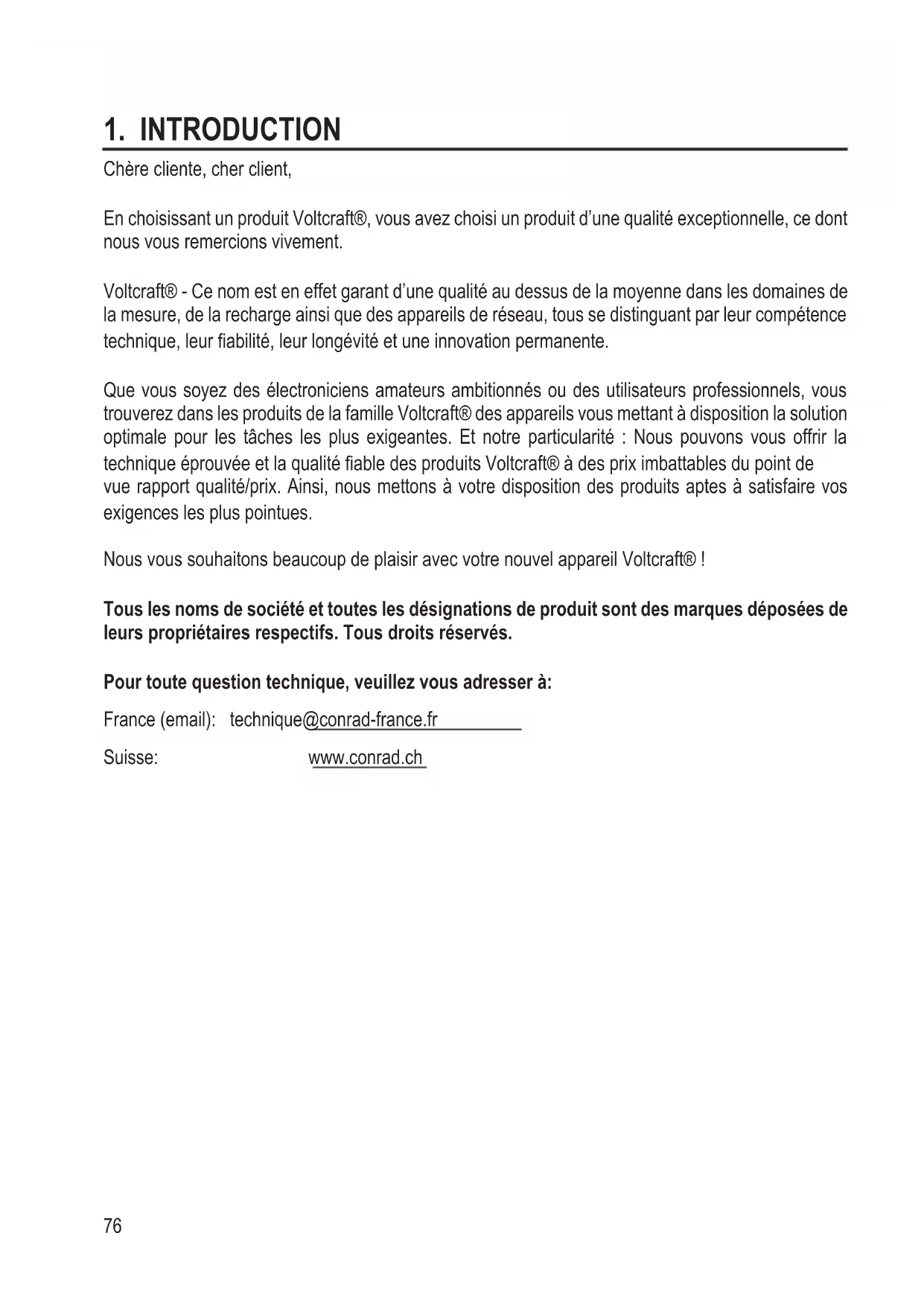 Chère cliente, cher client, En choisissant un produit Voltcraft®, vous avez choisi un produit d’une qualité exceptionnelle, ce dont nous vous remercions vivement. Voltcraft® - Ce nom est en effet garant d’une qualité au dessus de la moyenne dans les domaines de la mesure, de la recharge ainsi que des appareils de réseau, tous se distinguant par leur compétence technique, leur abilité, leur longévité et une innovation permanente. Que vous soyez des électroniciens amateurs ambitionnés ou des utilisateurs professionnels, vous trouverez dans les produits de la famille Voltcraft® des appareils vous mettant à disposition la solution optimale pour les tâches les plus exigeantes. Et notre particularité : Nous pouvons vous offrir la technique éprouvée et la qualité able des produits Voltcraft® à des prix imbattables du point de vue rapport qualité/prix. Ainsi, nous mettons à votre disposition des produits aptes à satisfaire vos exigences les plus pointues. Nous vous souhaitons beaucoup de plaisir avec votre nouvel appareil Voltcraft® ! Tous les noms de société et toutes les désignations de produit sont des marques déposées de leurs propriétaires respectifs. Tous droits réservés. Pour toute question technique, veuillez vous adresser à: France (email): technique@conrad-france.fr Suisse: www.conrad.ch77
