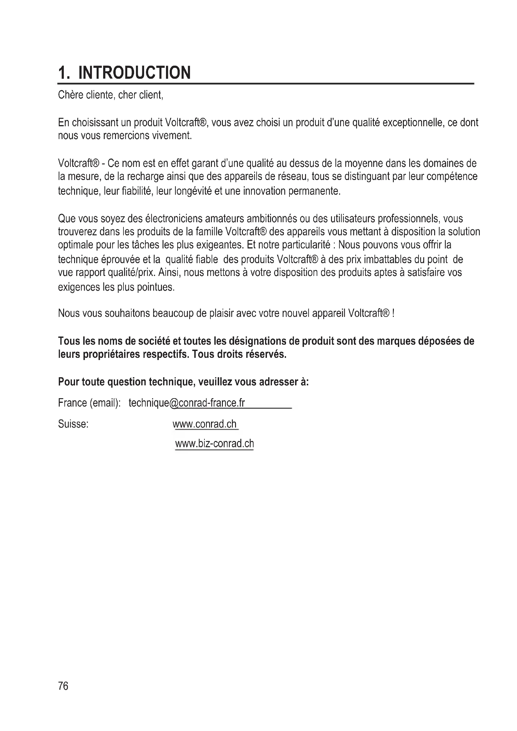 Chère cliente, cher client, En choisissant un produit Voltcraft®, vous avez choisi un produit d’une qualité exceptionnelle, ce dont nous vous remercions vivement. Voltcraft® - Ce nom est en effet garant d’une qualité au dessus de la moyenne dans les domaines de la mesure, de la recharge ainsi que des appareils de réseau, tous se distinguant par leur compétence technique, leur abilité, leur longévité et une innovation permanente. Que vous soyez des électroniciens amateurs ambitionnés ou des utilisateurs professionnels, vous trouverez dans les produits de la famille Voltcraft® des appareils vous mettant à disposition la solution optimale pour les tâches les plus exigeantes. Et notre particularité : Nous pouvons vous offrir la technique éprouvée et la qualité able des produits Voltcraft® à des prix imbattables du point de vue rapport qualité/prix. Ainsi, nous mettons à votre disposition des produits aptes à satisfaire vos exigences les plus pointues. Nous vous souhaitons beaucoup de plaisir avec votre nouvel appareil Voltcraft® ! Tous les noms de société et toutes les désignations de produit sont des marques déposées de leurs propriétaires respectifs. Tous droits réservés. Pour toute question technique, veuillez vous adresser à: France (email): technique@conrad-france.fr Suisse: www.conrad.ch www.biz-conrad.ch77