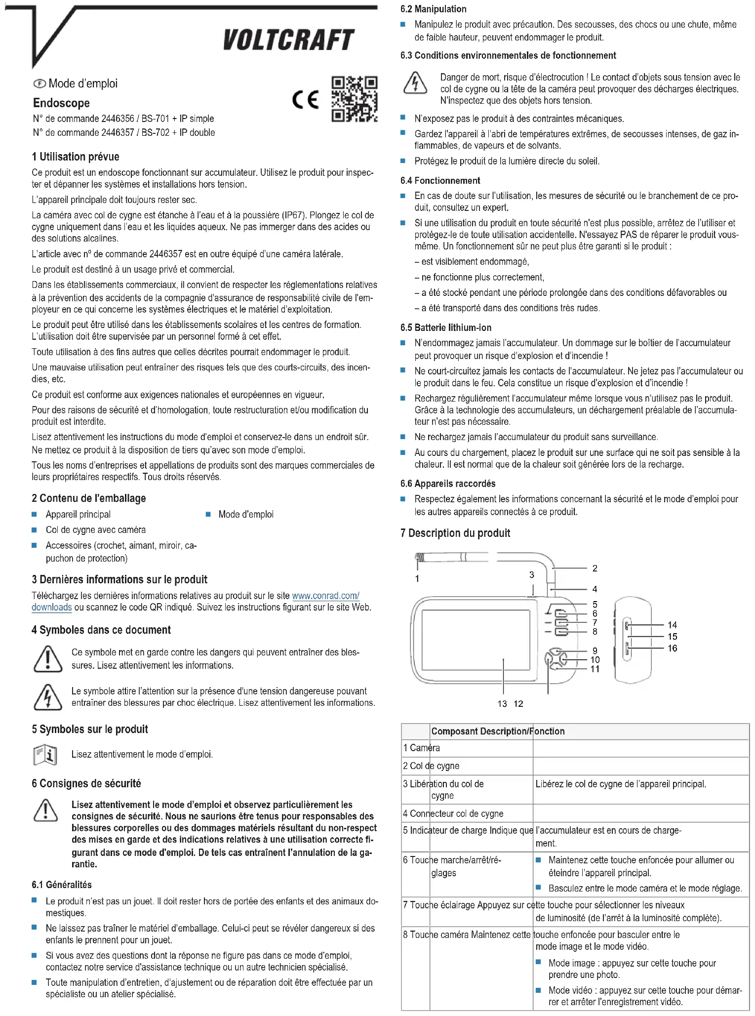 Operating temperature .................. 0 to +50 °C Operating humidity ........................ <95 % RH Storage temperature ...................... 0 to +50 °C Storage humidity ............................ <95 % RH Dimensions (W x H x D) (approx.) . 152 x 79 x 34 mm Weight (approx.) ............................ 357 g This is a publication by Conrad Electronic SE, Klaus-Conrad-Str. 1, D-92240 Hirschau (www.conrad.com). All rights including translation reserved. Reproduction by any method (e.g. photocopying, microfilming or the capture in electronic data processing systems) requires prior written approval from the editor. Reprinting, also in part, is prohibited. This publication reflects the technical status at the time of printing. Copyright by Conrad Electronic SE. *2446356_2446357_V1_0222_jh_mh_en pj-id: 18014398927490315-1 i/o: I3/O1 edtl-id: en8 Mode d’emploi Endoscope N° de commande 2446356 / BS-701 + IP simple N° de commande 2446357 / BS-702 + IP double 1 Utilisation prévue Ce produit est un endoscope fonctionnant sur accumulateur. Utilisez le produit pour inspec- ter et dépanner les systèmes et installations hors tension. L’appareil principale doit toujours rester sec. La caméra avec col de cygne est étanche à l’eau et à la poussière (IP67). Plongez le col de cygne uniquement dans l’eau et les liquides aqueux. Ne pas immerger dans des acides ou des solutions alcalines. L’article avec nº de commande 2446357 est en outre équipé d’une caméra latérale. Le produit est destiné à un usage privé et commercial. Dans les établissements commerciaux, il convient de respecter les réglementations relatives à la prévention des accidents de la compagnie d'assurance de responsabilité civile de l'em- ployeur en ce qui concerne les systèmes électriques et le matériel d’exploitation. Le produit peut être utilisé dans les établissements scolaires et les centres de formation. L’utilisation doit être supervisée par un personnel formé à cet effet. Toute utilisation à des fins autres que celles décrites pourrait endommager le produit. Une mauvaise utilisation peut entraîner des risques tels que des courts-circuits, des incen- dies, etc. Ce produit est conforme aux exigences nationales et européennes en vigueur. Pour des raisons de sécurité et d’homologation, toute restructuration et/ou modification du produit est interdite. Lisez attentivement les instructions du mode d’emploi et conservez-le dans un endroit sûr. Ne mettez ce produit à la disposition de tiers qu’avec son mode d’emploi. Tous les noms d’entreprises et appellations de produits sont des marques commerciales de leurs propriétaires respectifs. Tous droits réservés. 2 Contenu de l'emballage