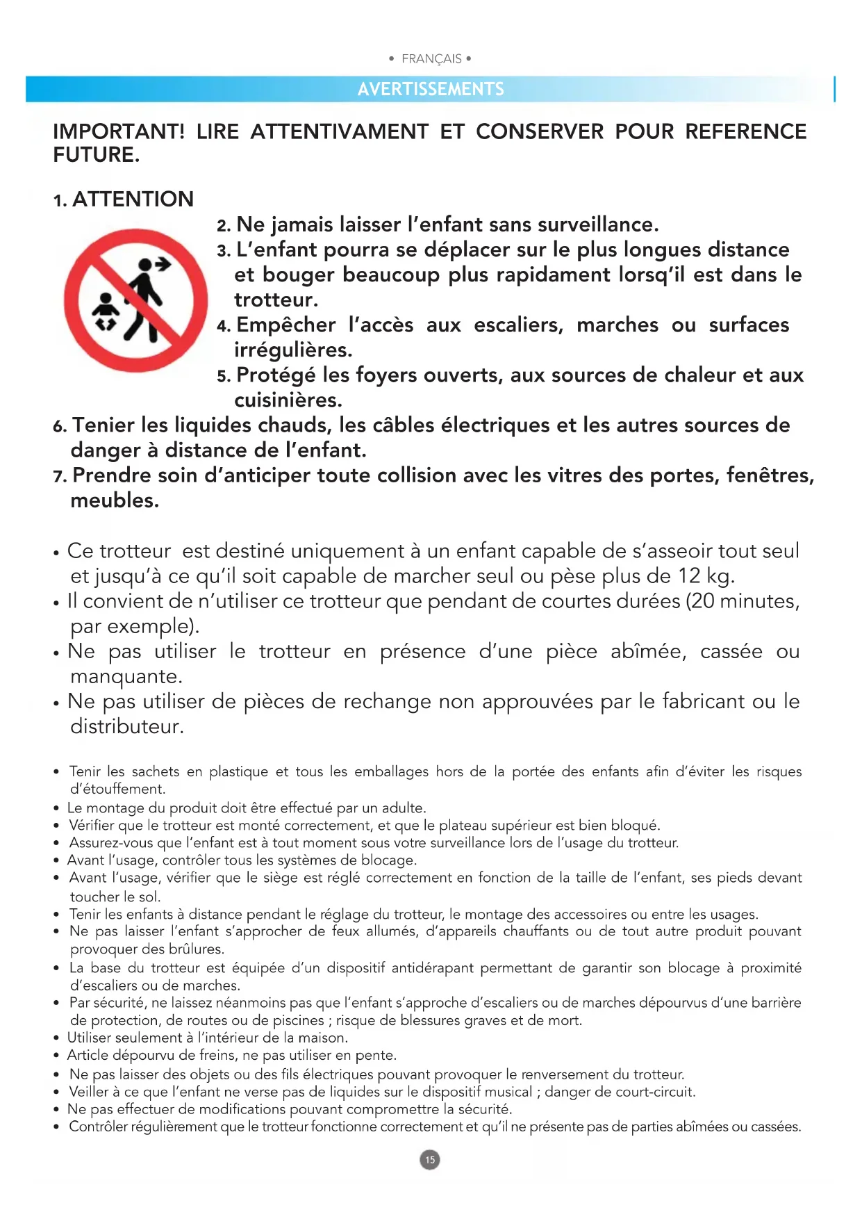 - Ce trotteur est destiné uniquement à un enfant capable de s’asseoir tout seul et jusqu’à ce qu’il soit capable de marcher seul ou pèse plus de 12 kg.