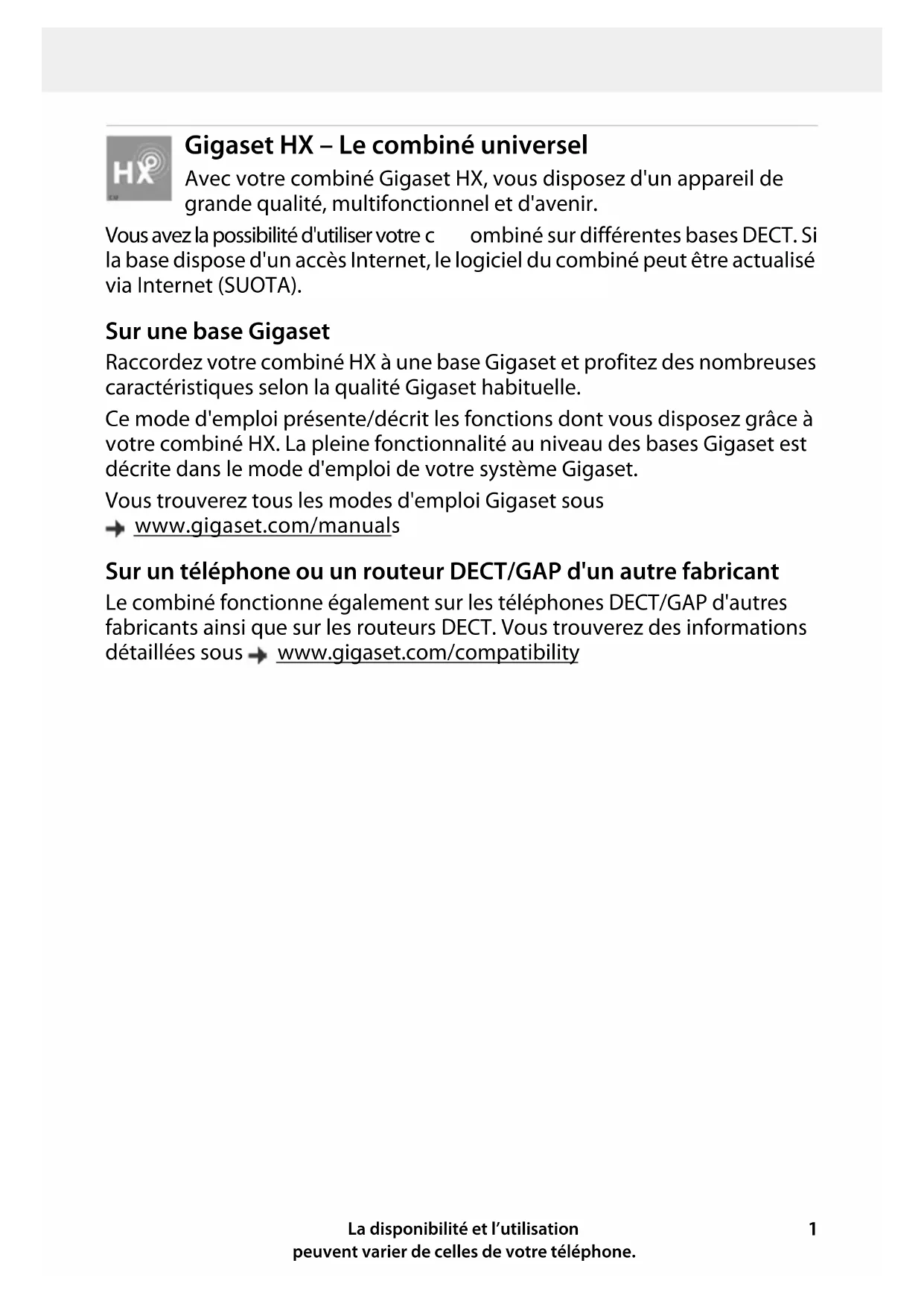 Gigaset HX – Le combiné universel Avec votre combiné Gigaset HX, vous disposez d'un appareil de grande qualité, multifonctionnel et d'avenir. Vous avez la possibilité d'utiliser votre c ombiné sur différentes bases DECT. Si la base dispose d'un accès Internet, le logiciel du combiné peut être actualisé via Internet (SUOTA). Sur une base Gigaset Raccordez votre combiné HX à une base Gigaset et profitez des nombreuses caractéristiques selon la qualité Gigaset habituelle. Ce mode d'emploi présente/décrit les fonctions dont vous disposez grâce à