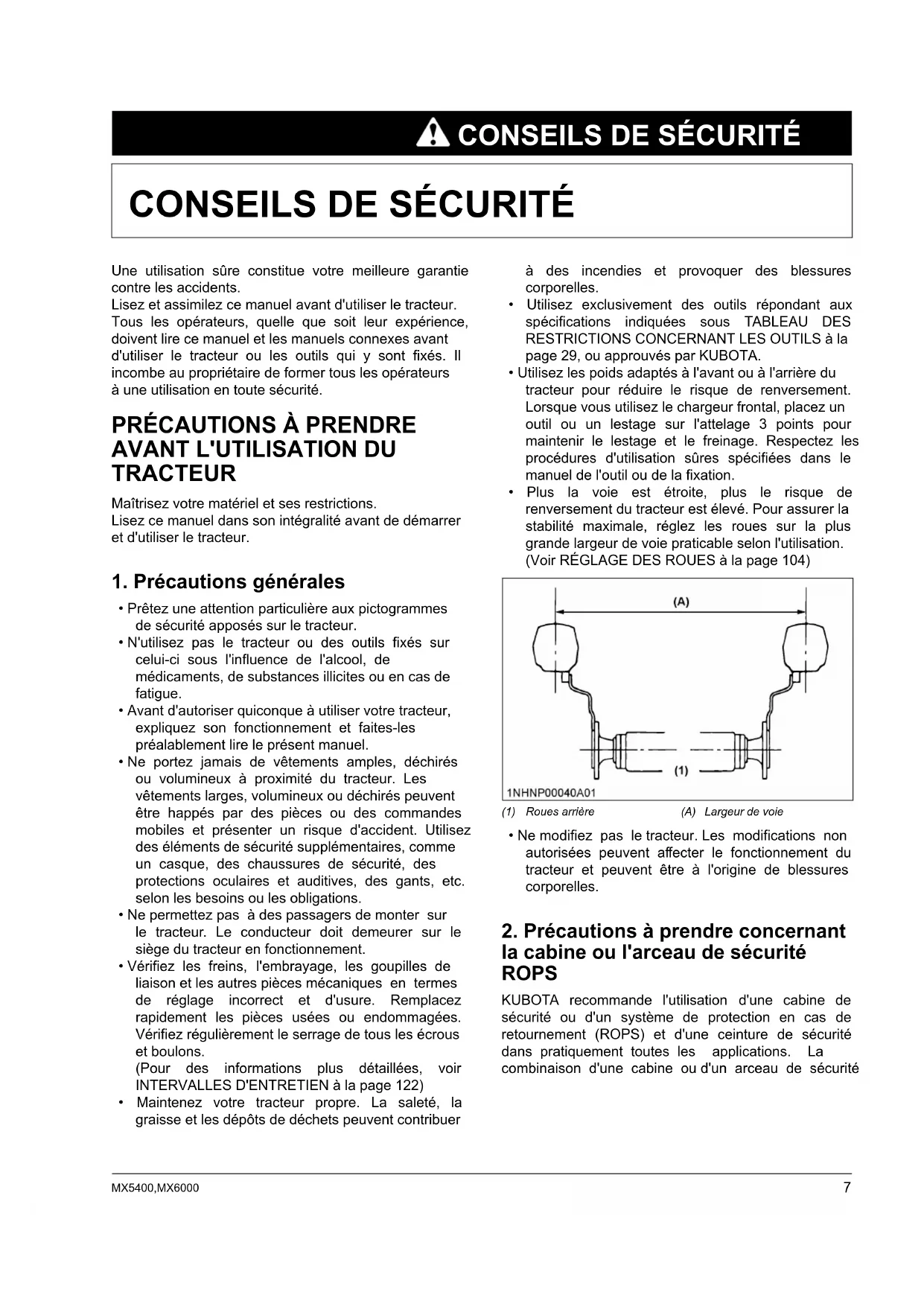 KUBOTA TRACTEUR MX5400·MX6000French (Canada)Nº de code.TC861-1971-5 MX5400 MX6000 MODELES 1VTAP00001A01QUI EST KUBOTA Corporation ... Depuis ses débuts en 1890, la Société KUBOTA Corporation s’est élevée au rang d’une des plus grandes entreprises du Japon. Pour arriver à ce stade, la société a pendant des années, diversifié la gamme de ses produits et de ses services, à tel point qu’elle dispose aujourd’hui de 30 usines, d’un effectif de 35 000 employés et fabrique plus de 1 000 produits différents, grands et petits. Tous ces produits et les services qui en dépendent sont cependant reliés par une organisation centralisée. La société KUBOTA fabrique des produits qui, pris à une échelle nationale sont des nécessités de base: produits indispensables, produits conçus pour aider les hommes et leurs nations à tirer parti du potentiel inhérent à leur environnement. Pour cela, KUBOTA est le Géant des nécessités de base. Ce potentiel inclut l’alimentation en eau, la production d’aliments à partir de la terre ou de la mer; le développement industriel, l’architecture et la construction, les transports. Des milliers de personnes font confiance au savoir-faire, à la technologie, à l’expérience et au service après-vente de la société KUBOTA. Vous pouvez vous aussi nous faire confiance. MX5400/MX6000 BA. B. 6-8. 2. K