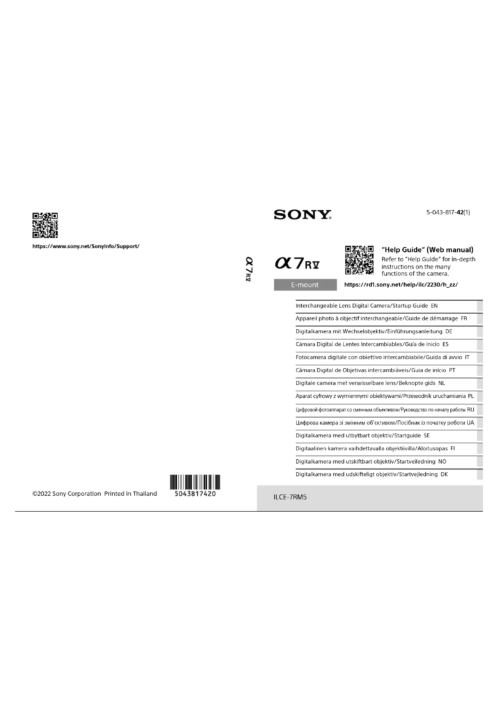 C:\Users\gotanda\Desktop\02FR-ILCE7RM5CEC\02FR.indd DTP data saved: 2023/04/05 16:06 PDF file created: 2023/04/05 16:07 Français Nous utilisons des matériaux d’emballage respectant l’environnement Des matériaux d’emballage respectant l’environnement ont été utilisés pour l’appareil et les accessoires fournis.Notez les points suivants dus aux caractéristiques des matériaux d’emballage.• Il se peut que de la poudre, etc. provenant des matériaux d’emballage adhère à l’appareil ou sur les accessoires fournis. Dans ce cas, retirez-la avec une poire soufflante ou une lingette de nettoyage en vente dans le commerce avant de l’utiliser.• Les matériaux d’emballage se détérioreront en cas d’utilisation continue. Faites attention lorsque vous transportez le produit par son emballage. À propos du manuel pour cet appareil https://rd1.sony.net/help/ilc/2230/h_zz/ «Guide d’aide» (Manuel en ligne) ILCE-7RM5 Guide d’aideCe guide décrit les préparatifs nécessaires pour commencer à utiliser le produit, les fonctions de base, etc. Pour plus d’informations, consultez le «Guide d’aide» (manuel en ligne).ILCE-7RM55-043-817-42(1)
