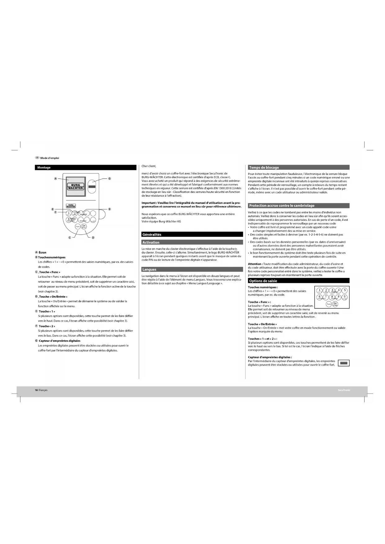 Écran Touches numériques Les chires «1» – «0» permettent des saisies numériques, par ex. des saisies de codes. „Touche «Func» La touche «Func» adapte sa fonction à la situation. Elle permet soit de retourner au niveau de menu précédent, soit de supprimer un caractère saisi, soit de passer au menu principal. L’écran ache la fonction active de la touche (voir chapitre3). „Touche «On/Entrée» La touche «On/Entrée» permet de démarrer le système ou de valider la fonction achée sur le menu. Touche«1» Si plusieurs options sont disponibles, cette touche permet de les faire déler vers le haut. Dans ce cas, l’écran ache cette possibilité (voir chapitre3). Touche«2» Si plusieurs options sont disponibles, cette touche permet de les faire déler vers le bas. Dans ce cas, l’écran ache cette possibilité (voir chapitre3). Capteur d’empreintes digitales Les empreintes digitales peuvent être stockées ou utilisées pour ouvrir le core-fort par l’intermédiaire du capteur d’empreintes digitales. Cher client, merci d’avoir choisi un core-fort avec l’électronique SecuTronic de BURG-WÄCHTER. Cette électronique est certiée d’après ECB, classe C. Vous avez acheté un produit qui répond à des exigences de sécurité extrême- ment élevées et qui a été développé et fabriqué conformément aux normes techniques en vigueur. Cette serrure est certiée d’après EN1300:2018 (Unités de stockage en lieu sûr - Classication des serrures haute sécurité en fonction de leur résistance à l’eraction). Important: Veuillez lire l’intégralité du manuel d’utilisation avant la pro- grammation et conservez ce manuel en lieu sûr pour référence ultérieure. Nous espérons que ce core BURG WÄCHTER vous apportera une entière satisfaction. Votre équipe Burg-Wächter KG Activation Langues La mise en marche du clavier électronique s’eectue à l’aide de la touche