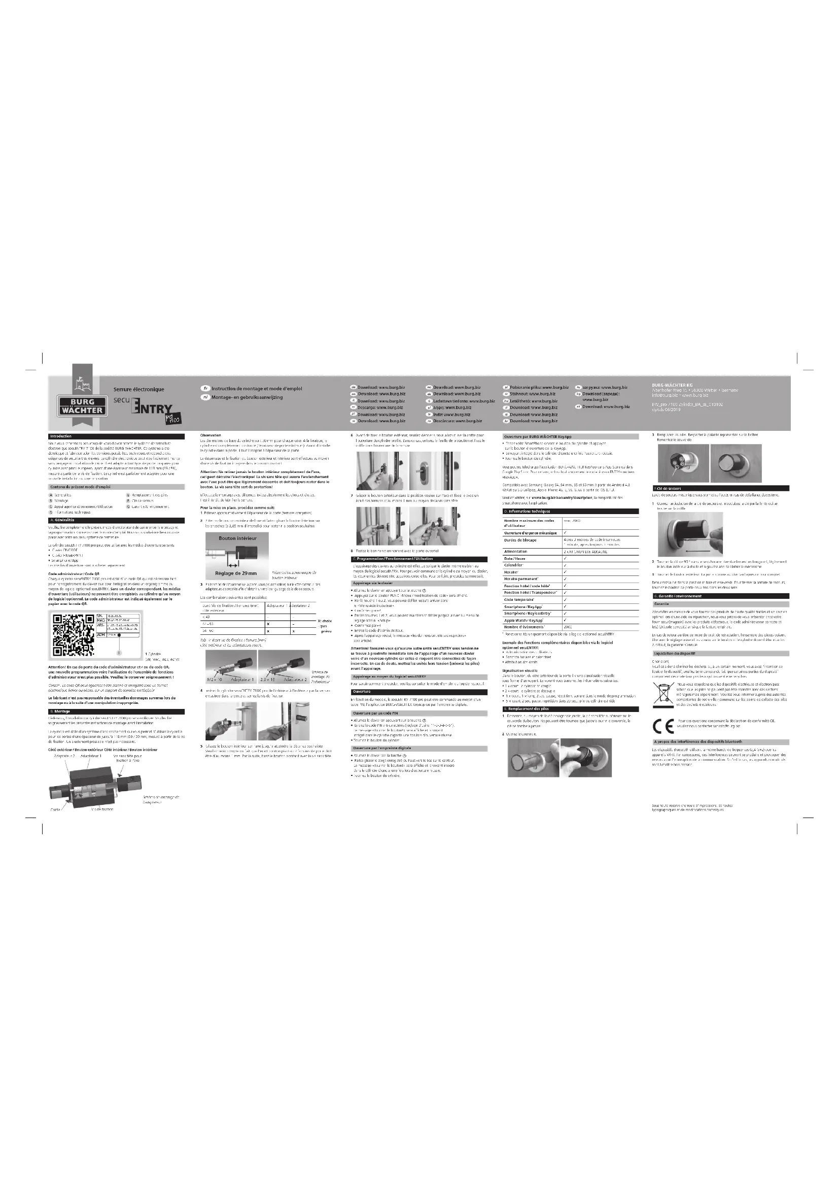 Fonctionnalités uniquement disponible via le logiciel optionnel secuENTRYExemple des fonctions complémentaires disponibles via le logiciel optionnel secuENTRY:• Administration des utilisateurs• Fonction horaire et calendrier• Attribution des droitsSignalisation visuelleDans le bouton, du côté extérieur de la porte il y une signalisation visuelle sous forme d’un voyant. Le voyant vous transmet les informations suivantes:• 1 x court: le cylindre se couple• 2 x court: le cylindre se découple• 1 x court, 1 × long, 2 sec. pause, répétition: serrure dans le mode de programmation• 5 × court, 2 sec. pause, répétition dans 20 sec.: pile du cylindre est videE. Remplacement des piles1 Desserrez, au moyen de la clé hexagonale jointe, la clé sans tête supérieure sur le couvercle du bouton. Ne pouvant être tournée que jusqu’à ouvrir le couvercle, la clé ne tombera jamais.2 Ouvrez le couvercle.3 Remplacez les piles. Respecter la polarité représentée sur le boîtier. Remontez le couvercle. F. Clé de secoursLa clé de secours mécanique vous permettra l’accès en cas de défaillance du système.1 Ouvrez l’articulation de la clé de secours et introduisez la clé par la fente qui se trouve sur la coiffe.2 Tournez la clé de 90 ° dans le sens horaire, éventuellement en bougeant, légèrement, le bouton extérieur à droite et à gauche afin de libérer le mécanisme.3 Tournez le bouton extérieur. La porte s’ouvre au plus tard après un tour complet.Retournez la clé dans la position initiale et enlevez-la. Pour fermer la serrure de secours, tournez le bouton de porte deux fois dans les deux sens.G. Garantie / environnementGarantieAfin d‘être en mesure de vous fournir des produits de haute qualité fiables et un soutien optimal lors d‘une aide ou réparation, nous vous prions de vous présenter chez votre fournisseur(magasin) avec les produits défectueux, le code administrateur correcte et le(s) QRCode correct(s) ainsi que la facture originale.En cas de retour au titre de votre de droit de rétractation, l’ensemble des pièces doivent être avec le réglage usine et les sceaux sur le bouton et le cylindre doivent être intactes. A défaut, la garantie s‘annule.Liquidation du dispositifCher client, Veuillez aider à éliminer les déchets. Si, à un certain moment, vous avez l’intention de liquider le dispositif, veuillez tenir compte du fait que certaines parties du dispositif comportent des matériaux précieux qui peuvent être recyclées. Nous vous rappelons que les dispositifs électriques et électroniques si bien que les piles ne peuvent pas être collectés avec des déchets ménagers mais séparément. Veuillez vous informer auprès des autorités compétentes de votre ville / commune sur les points de collecte des piles et des déchets électriques. Pour des questions concernant la déclaration de conformité CE, veuillez nous contacter sur info@burg.biz.A propos des interférences des dispositifs bluetoothLes dispositifs Bluetooth utilisent la même bande de fréquences (2,4 GHz) que les appareils Wi-Fi. Par conséquent, des interférences peuvent se produire et provoquer des erreurs voire l’interruption de la communication. Si c’est le cas, les appareils non utilisés sont à mettre hors tension.Elektronisch deurslot Instruction de montage et mode d‘emploi Montage- en gebruiksaanwijzing Download: www.burg.biz Download: www.burg.biz Download: www.burg.biz Descarga: www.burg.biz Download: www.burg.biz Download: www.burg.biz Download: www.burg.biz Download: www.burg.biz Ladattava tiedosto: www.burg.biz λήψη: www.burg.biz İndir: www.burg.biz Descărcare: www.burg.biz Pobieranie pliku: www.burg.biz Stáhnout: www.burg.biz Letölthető: www.burg.biz Download: www.burg.biz Download: www.burg.biz Download: www.burg.biz загрузка: www.burg.biz Download (зареди): www.burg.biz Download: www.burg.biz Druk- en zetfouten evenals technische wijzigingen voorbehouden.