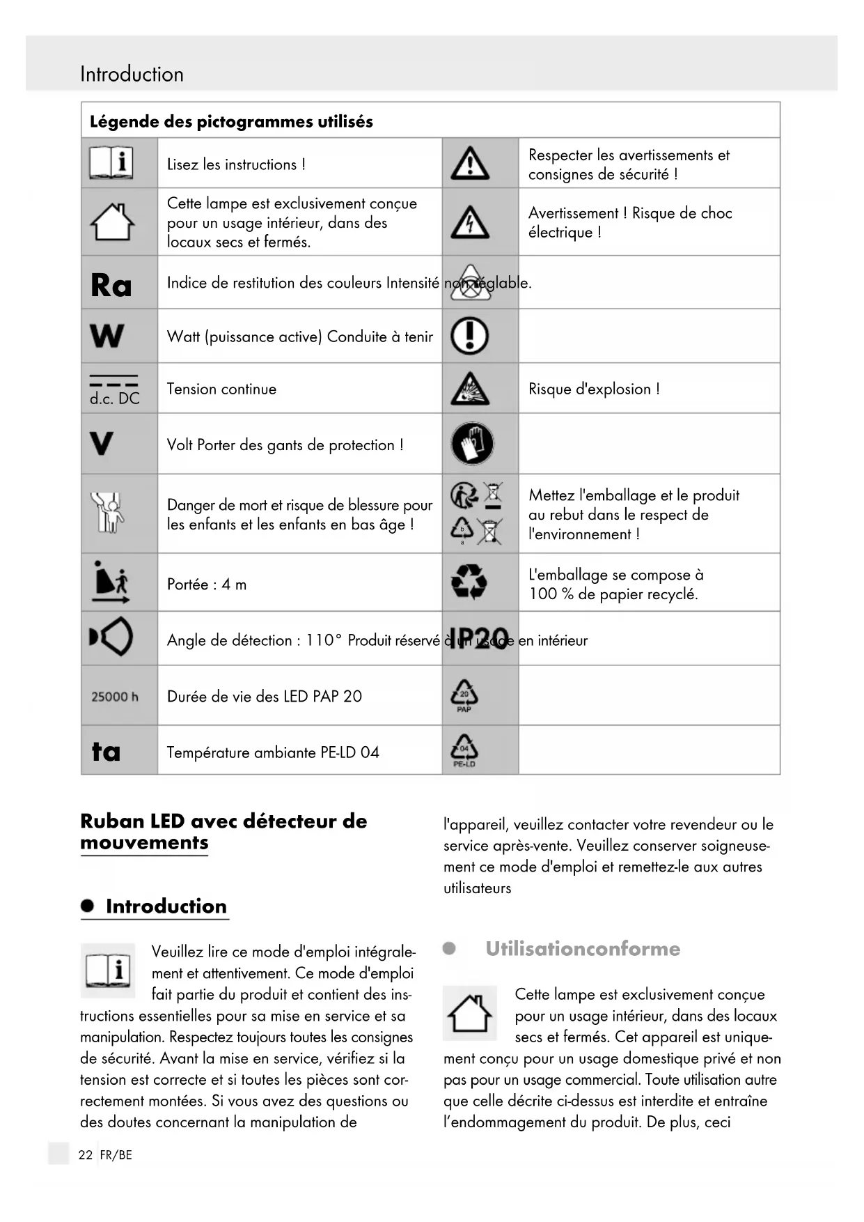 Mettez l'emballage et le produit au rebut dans le respect de l'environnement ! Portée : 4 m L'emballage se compose à 100 % de papier recyclé. Angle de détection : 110° Produit réservé à un usage en intérieur Durée de vie des LED PAP 20