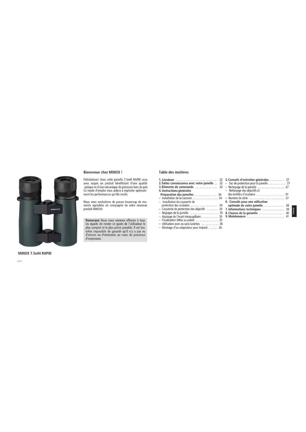 Bienvenue chez MINOX ! Félicitations! Avec cette jumelle 7.5x44 RAPID vous avez acquis un produit bénéficiant d’une qualité optique et d’une mécanique de précision hors de pair. Ce mode d’emploi vous aidera à exploiter optimale- ment les performances qu’elle recèle. Nous vous souhaitons de passer beaucoup de mo- ments agréables en compagnie de votre nouveau produit MINOX! Remarque: Nous nous sommes efforcés à tous les égards de render ce guide de l’utilisateur le plus complet et le plus précis possible. Il est tou- tefois impossible de garantir qu’il n’y a pas eu d’erreurs ou d’omissions au cours du processus d’impression.1