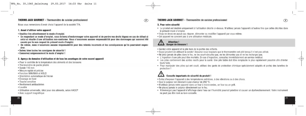 - Remarque : Veuillez vous assurer que votre appareil est éteint avant de changer la pile (la sonde de température doit être repliée.) TFA_No. 30.1060_Anleitung 29.03.2017 14:33 Uhr Seite 132726 THERMO JACK GOURMET – Thermomètre de cuisine professionnel