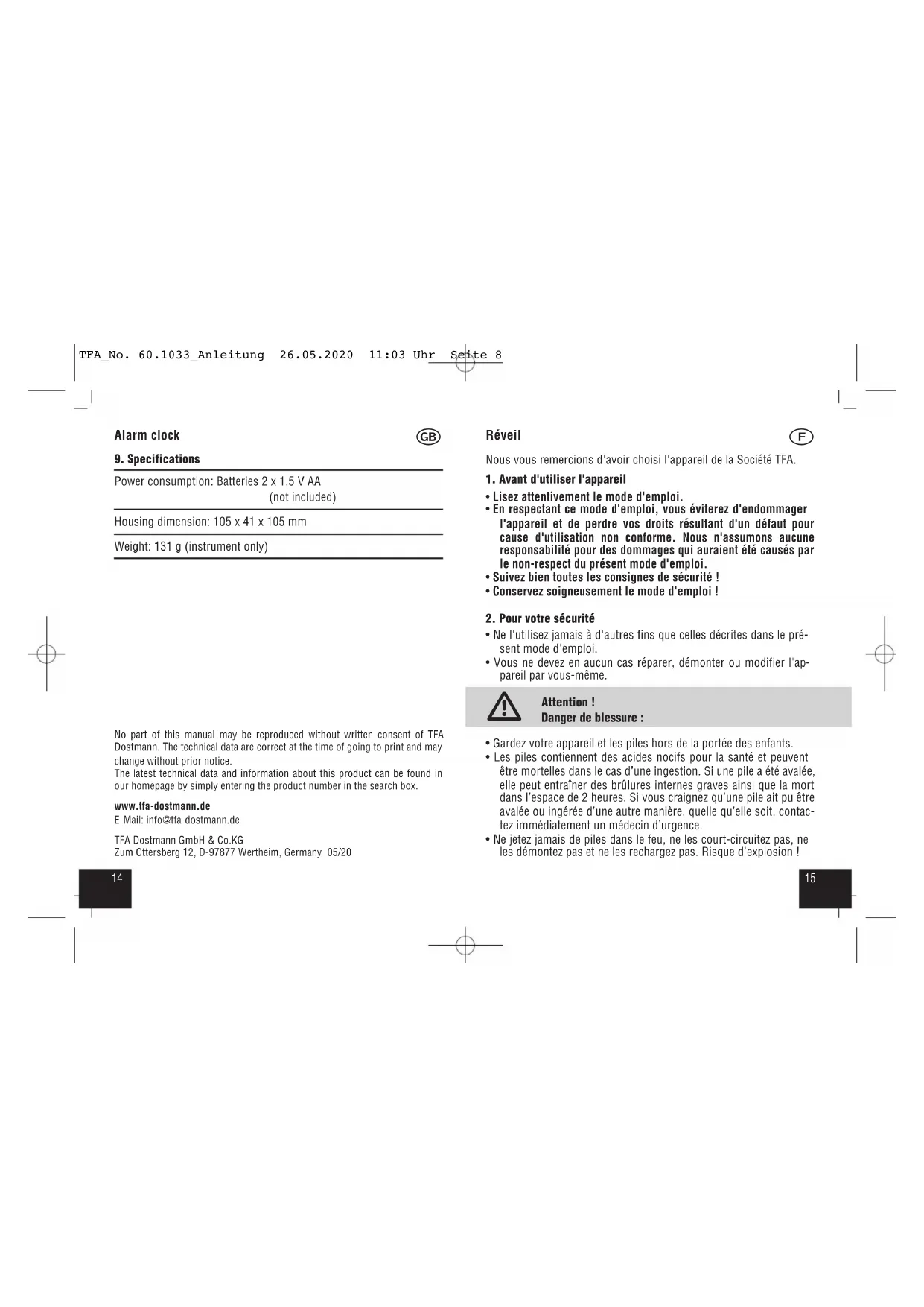 - Ne jetez jamais de piles dans le feu, ne les court-circuitez pas, ne les démontez pas et ne les rechargez pas. Risque d'explosion ! TFA_No. 60.1033_Anleitung 26.05.2020 11:03 Uhr Seite 81716 Réveil