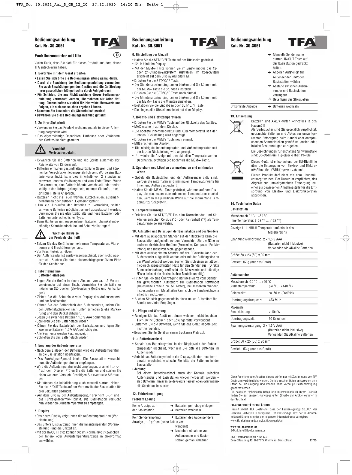 Retrouvez gratuitement la notice de l'appareil 30.3051.01 TFA au format PDF.