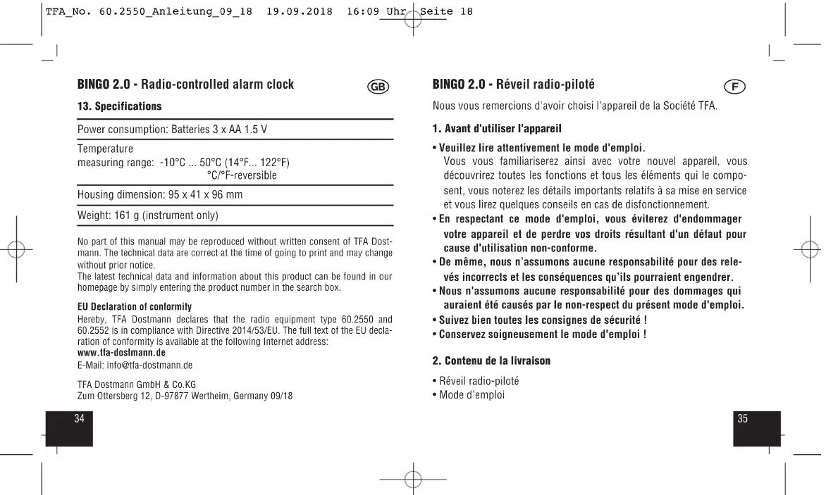 - Gardez l'appareil et les piles hors de la portée des enfants. TFA_No. 60.2550_Anleitung_09_18 19.09.2018 16:09 Uhr Seite 193938 BINGO 2.0 - Réveil radio-piloté