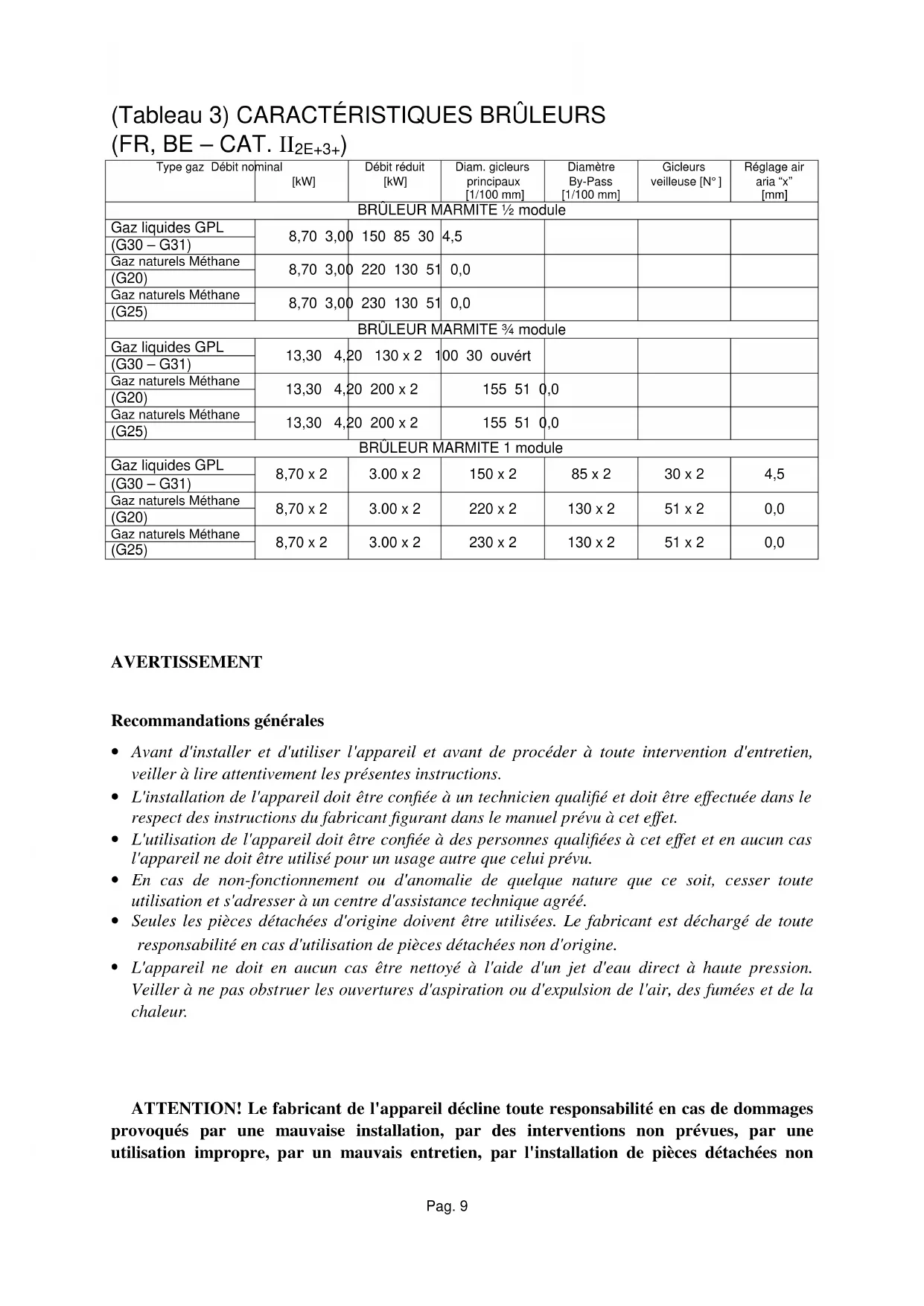 ATTENTION! Le fabricant de l'appareil décline toute responsabilité en cas de dommages provoqués par une mauvaise installation, par des interventions non prévues, par une utilisation impropre, par un mauvais entretien, par l'installation de pièces détachées nonPag. 10 d'origine, par le non-respect des normes en vigueur sur le lieu d'installation, par la négligence et par le non-respect des instructions du présent manuel. A l'attention de l'installateur