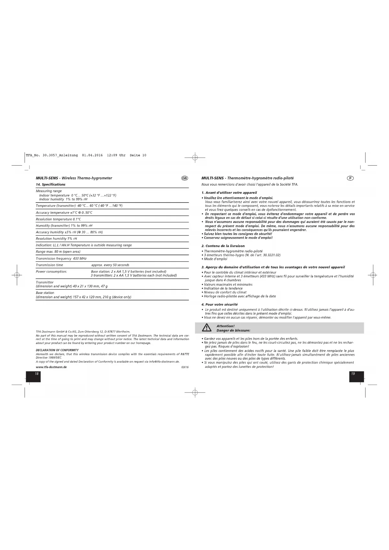 Nous déclarons que cet appareil émetteur récepteur d'ondes radio répond aux exigences essentielles de la directive R&TTE 1999/5/CE. Une copie signée et datée de la déclaration de conformité est disponible sur demande auprès de info@tfa-dost- mann.de. www.tfa-dostmann.de 03/16