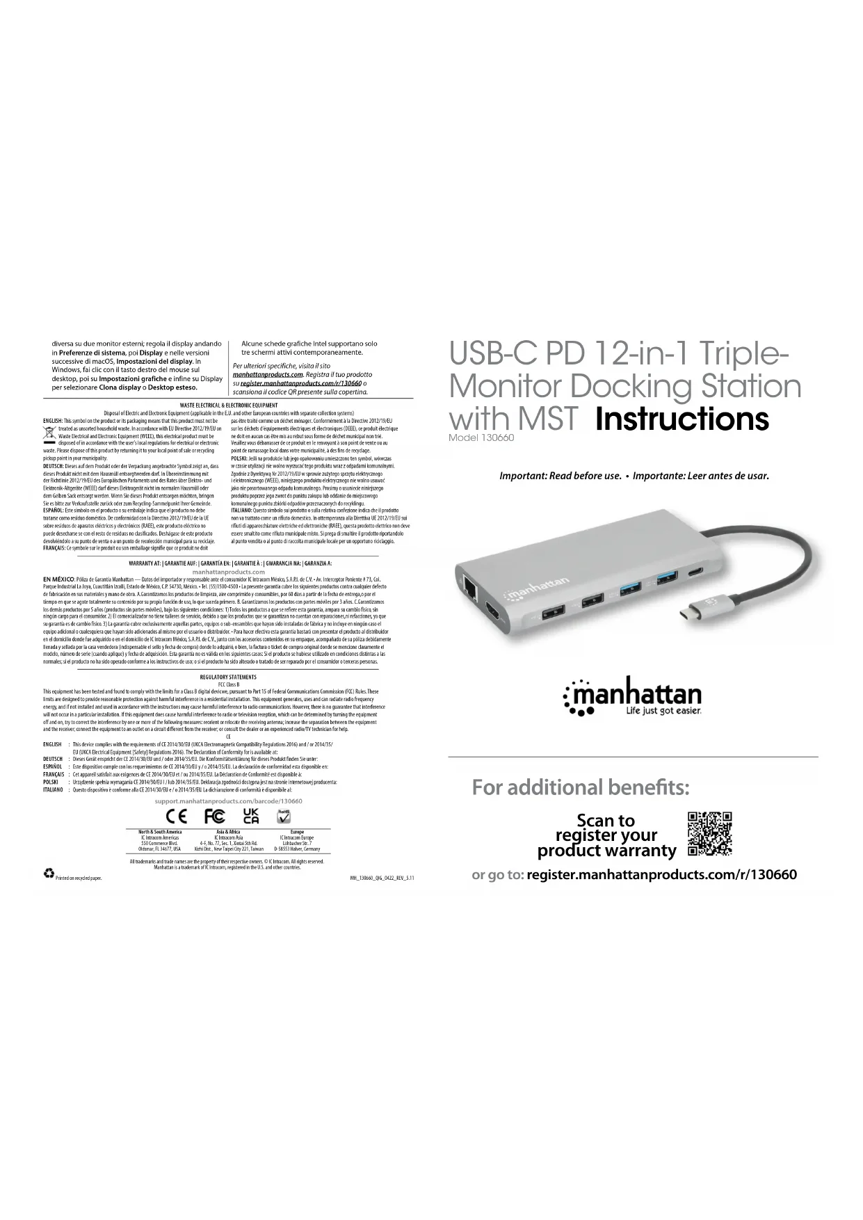 - Sortie vidéo : macOS ne prend pas en charge les sorties vidéo différentes pour deux moniteurs externes; réglez les affichages en allant dans Préférences Système, puis Affichages et, dans les versions ultérieures de macOS, Paramètres d’affichage. Sous Windows, effectuez un clic droit sur le Bureau, cliquez ensuite sur Paramètres d’affichage, puis sur Affichage pour sélectionner Dupliquer ces affichages ou Bureau étendu. Certaines cartes graphiques Intel ne prennent en charge que trois écrans actifs à la fois. Vous trouvez les spécifications sur manhattanproducts.com. Enregistrez votre produit sur register.manhattanproducts.com/r/130660 ou scannez le code QR figurant sur la couverture. POLSKI Funkcja Plug and play zapewnia szybką i łatwą konfigurację – nie wymaga pobierania sterowników. Uwagi:
