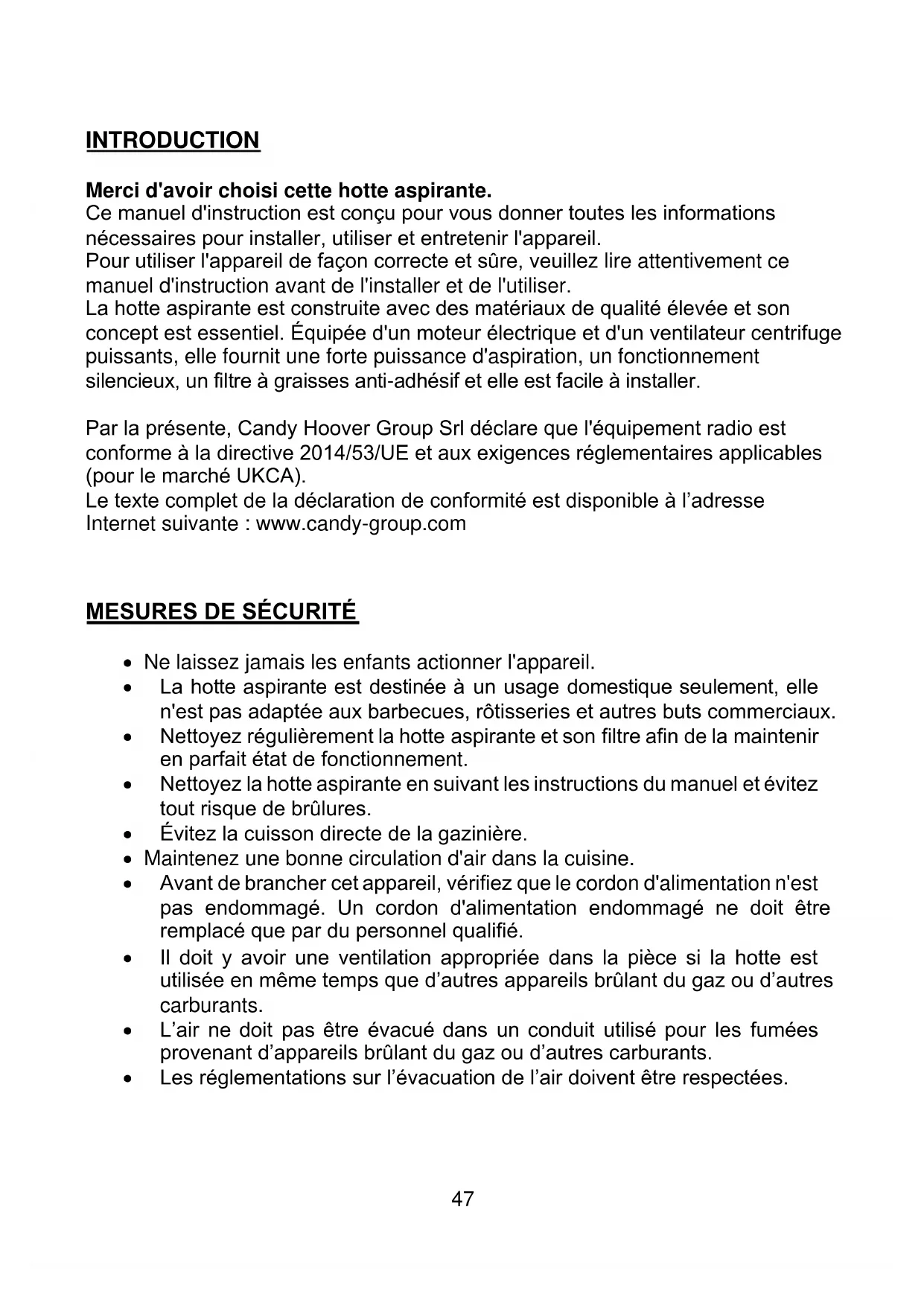 FONCTIONNEMENT 56 ENTRETIEN 58 DÉPANNAGE 5947 INTRODUCTION Merci d'avoir choisi cette hotte aspirante. Ce manuel d'instruction est conçu pour vous donner toutes les informations nécessaires pour installer, utiliser et entretenir l'appareil. Pour utiliser l'appareil de façon correcte et sûre, veuillez lire attentivement ce manuel d'instruction avant de l'installer et de l'utiliser. La hotte aspirante est construite avec des matériaux de qualité élevée et son concept est essentiel. Équipée d'un moteur électrique et d'un ventilateur centrifuge puissants, elle fournit une forte puissance d'aspiration, un fonctionnement silencieux, un filtre à graisses anti-adhésif et elle est facile à installer. Par la présente, Candy Hoover Group Srl déclare que l'équipement radio est conforme à la directive 2014/53/UE et aux exigences réglementaires applicables (pour le marché UKCA). Le texte complet de la déclaration de conformité est disponible à l’adresse Internet suivante : www.candy-group.com