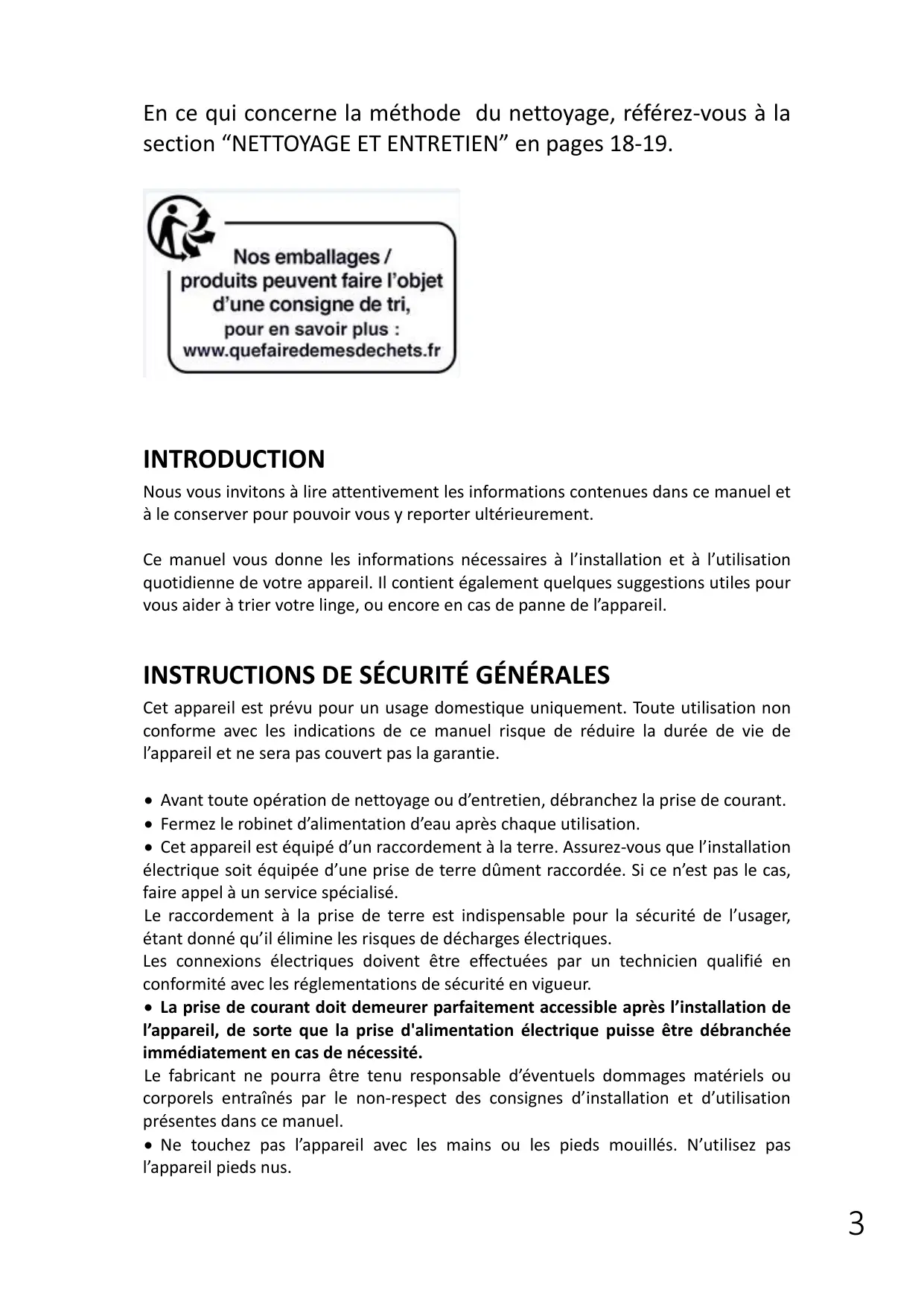 En ce qui concerne la méthode du nettoyage, référez-vous à la section “NETTOYAGE ET ENTRETIEN” en pages 18-19. INTRODUCTION Nous vous invitons à lire attentivement les informations contenues dans ce manuel et à le conserver pour pouvoir vous y reporter ultérieurement. Ce manuel vous donne les informations nécessaires à l’installation et à l’utilisation quotidienne de votre appareil. Il contient également quelques suggestions utiles pour vous aider à trier votre linge, ou encore en cas de panne de l’appareil. INSTRUCTIONS DE SÉCURITÉ GÉNÉRALES Cet appareil est prévu pour un usage domestique uniquement. Toute utilisation non conforme avec les indications de ce manuel risque de réduire la durée de vie de l’appareil et ne sera pas couvert pas la garantie. Avant toute opération de nettoyage ou d’entretien, débranchez la prise de courant. Fermez le robinet d’alimentation d’eau après chaque utilisation. Cet appareil est équipé d’un raccordement à la terre. Assurez-vous que l’installation électrique soit équipée d’une prise de terre dûment raccordée. Si ce n’est pas le cas, faire appel à un service spécialisé. Le raccordement à la prise de terre est indispensable pour la sécurité de l’usager, étant donné qu’il élimine les risques de décharges électriques. Les connexions électriques doivent être effectuées par un technicien qualifié en conformité avec les réglementations de sécurité en vigueur. La prise de courant doit demeurer parfaitement accessible après l’installation de l’appareil, de sorte que la prise d'alimentation électrique puisse être débranchée immédiatement en cas de nécessité. Le fabricant ne pourra être tenu responsable d’éventuels dommages matériels ou corporels entraînés par le non-respect des consignes d’installation et d’utilisation présentes dans ce manuel. Ne touchez pas l’appareil avec les mains ou les pieds mouillés. N’utilisez pas l’appareil pieds nus.