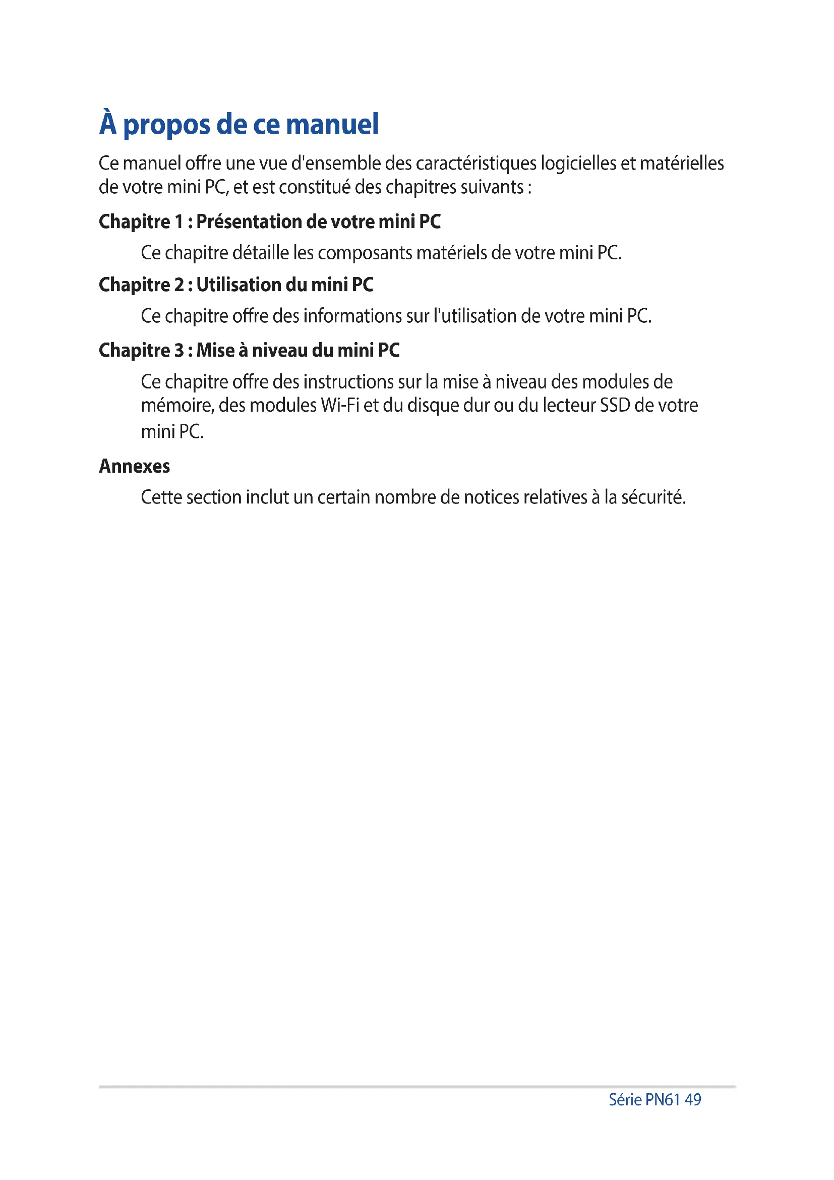Ce chapitre ore des instructions sur la mise à niveau des modules de mémoire, des modules Wi-Fi et du disque dur ou du lecteur SSD de votre mini PC. Annexes Cette section inclut un certain nombre de notices relatives à la sécurité.50 Série PN61 Messages Pour mettre en valeur les informations essentielles oertes par ce guide, les messages sont présentés de la manière qui suit : IMPORTANT ! Ce message contient des informations essentielles devant être suivies pour compléter une tâche. REMARQUE : Ce message contient des informations et des astuces additionnelles pouvant vous aider à compléter certaines tâches. AVERTISSEMENT ! Ce message contient des informations importantes devant être suivies pour garantir votre sécurité lors de l'exécution de certaines tâches et de ne pas endommager les données du mini PC et ses composants. Typographie Texte en gras Indique un menu ou un élément à sélectionner. Italique Indique les sections de ce manuel auxquelles vous pouvez vous référer.Série PN61 51 Contenu de la boîte La boîte de votre mini PC contient les éléments suivants : Mini PC ASUS Série PN61 Adaptateur secteur* Cordon d'alimentation* Documentation technique52 Série PN61 REMARQUE :