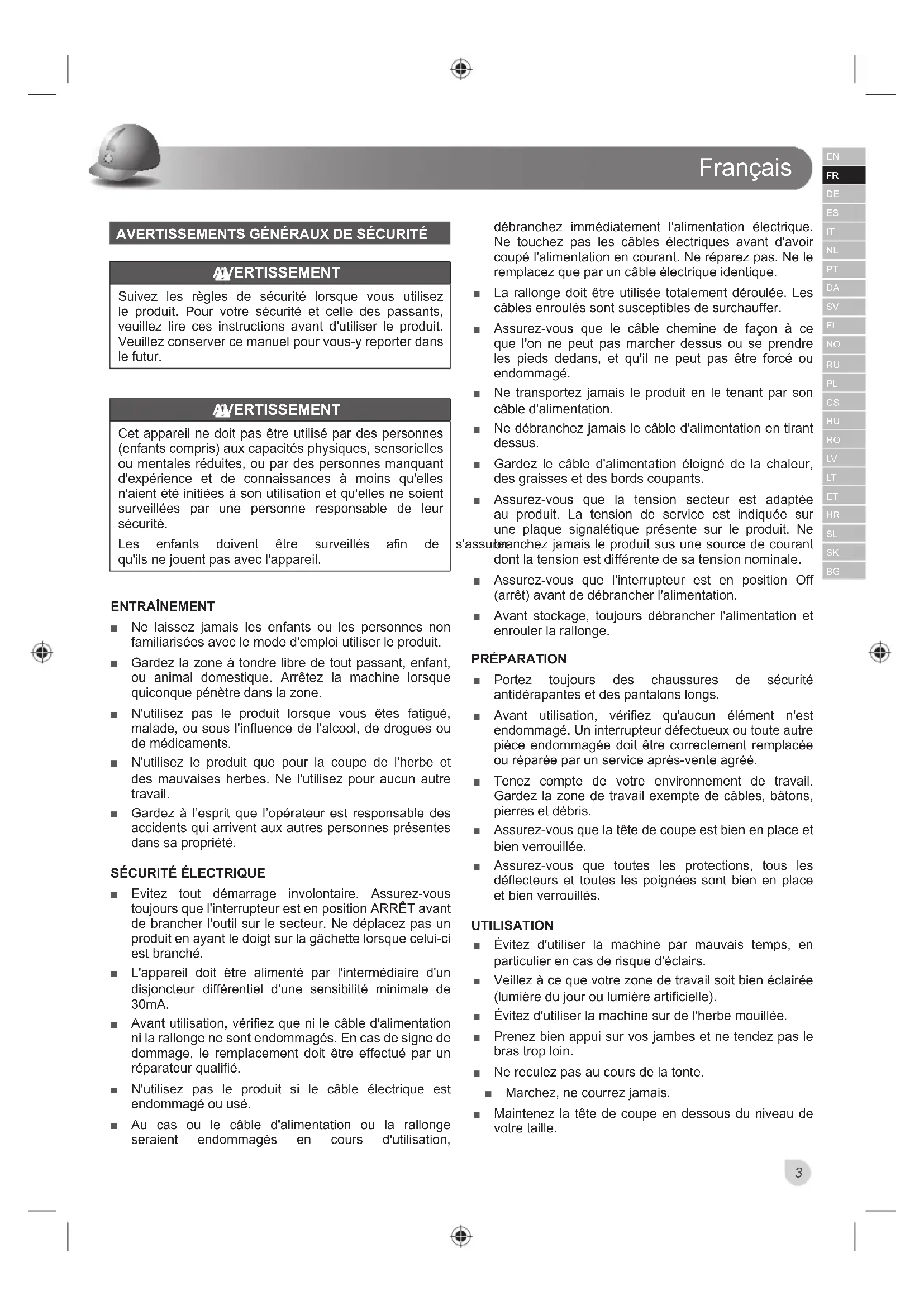 Ŷ Evitez tout démarrage involontaire. Assurez-vous toujours que l'interrupteur est en position ARRÊT avant de brancher l'outil sur le secteur. Ne déplacez pas un produit en ayant le doigt sur la gâchette lorsque celui-ci est branché. Ŷ L'appareil doit être alimenté par l'intermédiaire d'un disjoncteur différentiel d'une sensibilité minimale de 30mA. Ŷ Avant utilisation, vérifiez que ni le câble d'alimentation ni la rallonge ne sont endommagés. En cas de signe de dommage, le remplacement doit être effectué par un réparateur qualifié. Ŷ N'utilisez pas le produit si le câble électrique est endommagé ou usé. Ŷ Au cas ou le câble d'alimentation ou la rallonge seraient endommagés en cours d'utilisation, débranchez immédiatement l'alimentation électrique. Ne touchez pas les câbles électriques avant d'avoir coupé l'alimentation en courant. Ne réparez pas. Ne le remplacez que par un câble électrique identique. Ŷ La rallonge doit être utilisée totalement déroulée. Les câbles enroulés sont susceptibles de surchauffer. Ŷ Assurez-vous que le câble chemine de façon à ce que l'on ne peut pas marcher dessus ou se prendre les pieds dedans, et qu'il ne peut pas être forcé ou endommagé. Ŷ Ne transportez jamais le produit en le tenant par son câble d'alimentation. Ŷ Ne débranchez jamais le câble d'alimentation en tirant dessus. Ŷ Gardez le câble d'alimentation éloigné de la chaleur, des graisses et des bords coupants. Ŷ Assurez-vous que la tension secteur est adaptée au produit. La tension de service est indiquée sur une plaque signalétique présente sur le produit. Ne branchez jamais le produit sus une source de courant dont la tension est différente de sa tension nominale. Ŷ Assurez-vous que l'interrupteur est en position Off (arrêt) avant de débrancher l'alimentation. Ŷ Avant stockage, toujours débrancher l'alimentation et enrouler la rallonge. PRÉPARATION Ŷ Portez toujours des chaussures de sécurité antidérapantes et des pantalons longs. Ŷ Avant utilisation, vérifiez qu'aucun élément n'est endommagé. Un interrupteur défectueux ou toute autre pièce endommagée doit être correctement remplacée ou réparée par un service après-vente agréé. Ŷ Tenez compte de votre environnement de travail. Gardez la zone de travail exempte de câbles, bâtons, pierres et débris. Ŷ Assurez-vous que la tête de coupe est bien en place et bien verrouillée. Ŷ Assurez-vous que toutes les protections, tous les déflecteurs et toutes les poignées sont bien en place et bien verrouillés. UTILISATION Ŷ Évitez d'utiliser la machine par mauvais temps, en particulier en cas de risque d'éclairs. Ŷ Veillez à ce que votre zone de travail soit bien éclairée (lumière du jour ou lumière artificielle). Ŷ Évitez d'utiliser la machine sur de l'herbe mouillée. Ŷ Prenez bien appui sur vos jambes et ne tendez pas le bras trop loin. Ŷ Ne reculez pas au cours de la tonte. Ŷ Marchez, ne courrez jamais. Ŷ Maintenez la tête de coupe en dessous du niveau de votre taille.Français