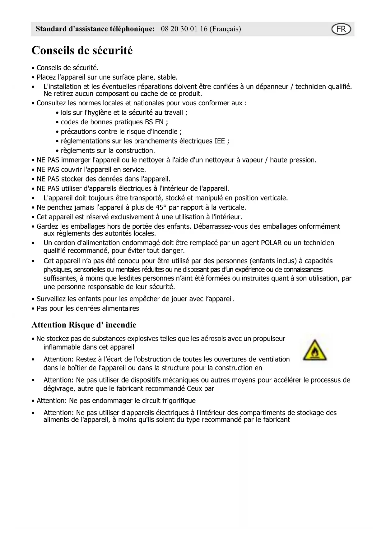 - Toute réparation doit être confiée à un agent POLAR ou à un technicien qualifié. Nettoyage du condensateur Nettoyer régulièrement le condensateur peut prolonger la vie de l'appareil. Le condensateur se situe à l'arrière de l'appareil. Remarque : le démarrage d'une décongélation manuelle réinitialise le temporisateur du cycle de décongélation automatique. Le témoin de décongélation s'allume pendant la décongélation de l'appareil. Remarque : Nettoyez les ailettes du condensateur en veillant à ne pas les endommager, à l'aide d'une brosse à poils doux ou d'un aspirateur.FR Standard d'assistance téléphonique: 08 20 30 01 16 (Français) Dépannage En cas de dysfonctionnement de votre appareil POLAR, vérifiez les données du tableau ci-dessous avant d'appeler notre standard d'assistance ou votre revendeur POLAR. Spécifications techniques Dysfonctionnement Cause probable Intervention L'appareil ne fonctionne pas L'appareil n'est pas allumé Vérifier que l'appareil est bien branché et allumé La prise et le cordon sont endommagés Appeler un agent POLAR ou un technicien qualifié Alimentation Vérifier l'alimentation Problème de branchement interne Appeler un agent POLAR ou un technicien qualifié L'appareil s'allume, mais la température est trop haute / basse Excès de glace sur le condensateur Décongeler l'appareil Le condensateur est satur7é de poussières Dépoussiérer le condensateur Les portes sont mal fermées Vérifier que les portes sont fermées et l'état des joints L'appareil est situé près d'une source de chaleur ou l'air ne circule pas librement vers le condensateur Placer l'appareil à un endroit plus propice à son bon fonctionnement Température ambiante trop haute Augmenter la ventilation ou placer l'appareil à un endroit plus frais Ailettes insuffisamment ventilées Débarrasser les ailettes d'éventuelles obstructions L'appareil est surchargé Réduire la quantité d'aliments stockés dans l'appareil Paramètres d'usine par défaut ajustés Appeler un agent POLAR ou un technicien qualifié L'appareil fait beaucoup de bruit L'appareil est en contact avec un objet placé à proximité Vérifier l'emplacement et déplacer l'appareil si nécessaire La surface sur laquelle l'appareil a été posé n'est pas de niveau ou l'appareil n'est pas stable Vérifier l'emplacement et déplacer l'appareil si nécessaire Modèle Tension Puissance Courant Plage de température Capacité (litres) Réfrigérant Dimensions h x l x p mm Poids (kg) CB929 230V 50Hz 160W 1.1A 2°C to 8°C 140 R600a 40g 925 x 600 x 540 54 CB930 230V 50Hz 280W 1.8A 2°C to 8°C 223 R600a 55g 925 x 920 x 540 75 CB931 230V 50Hz 280W 1.8A 2°C to 8°C 223 R600a 55g 925 x 920 x 535 72 CB932 230V 50Hz 315W 1.9A 2°C to 8°C 335 R600a 60g 925 x 1350 x 540 95 CC601 230V 50Hz 280W 1.8A 2°C to 8°C 223 R600a 55g 925 x 920 x 535 95 CC605 230V 50Hz 315W 1.9A 2°C to 8°C 335 R600a 60g 925 x 1350 x 535 91 CD089 230V 50Hz 160W 1.1A 2°C to 8°C 140 R600a 40g 925 x 600 x 535 54 CE205 230V 50Hz 160W 1.1A 2°C to 8°C 140 R600a 40g 925 x 600 x 540 54 CE206 230V 50Hz 280W 1.8A 2°C to 8°C 223 R600a 55g 925 x 920 x 540 75 CE207 230V 50Hz 315W 1.9A 2°C to 8°C 335 R600a 60g 925 x 1350 x 540 95 CF759 230V 50Hz 280W 1.8A 2°C to 8°C 223 R600a 55g 870 x 920 x 535 62 GH132 230V 50Hz 160W 1.1A 2°C to 8°C 140 R600a 40g 925 x 600 x 540 54 GH133 230V 50Hz 280W 1.8A 2°C to 8°C 223 R600a 55g 925 x 920 x 540 75 GH134 230V 50Hz 315W 1.9A 2°C to 8°C 335 R600a 60g 925 x 1350 x 540 95 DP286 230V 50Hz 160W 1.1A 2°C to 8°C 140 R600a 40g 870 x 600 x 540 54 DP287 230V 50Hz 280W 1.8A 2°C to 8°C 223 R600a 55g 870 x 920 x 540 75 GJ447 230V 50Hz 300W 1.2A 2°C to 8°C 307 R600a 85g 1880 x 600 x 514 112FR Standard d'assistance téléphonique: 050 – 600006 (Belgique) Raccordement électrique La prise doit être reliée à la prise secteur qui convient. Cet appareil est câblé comme suit :