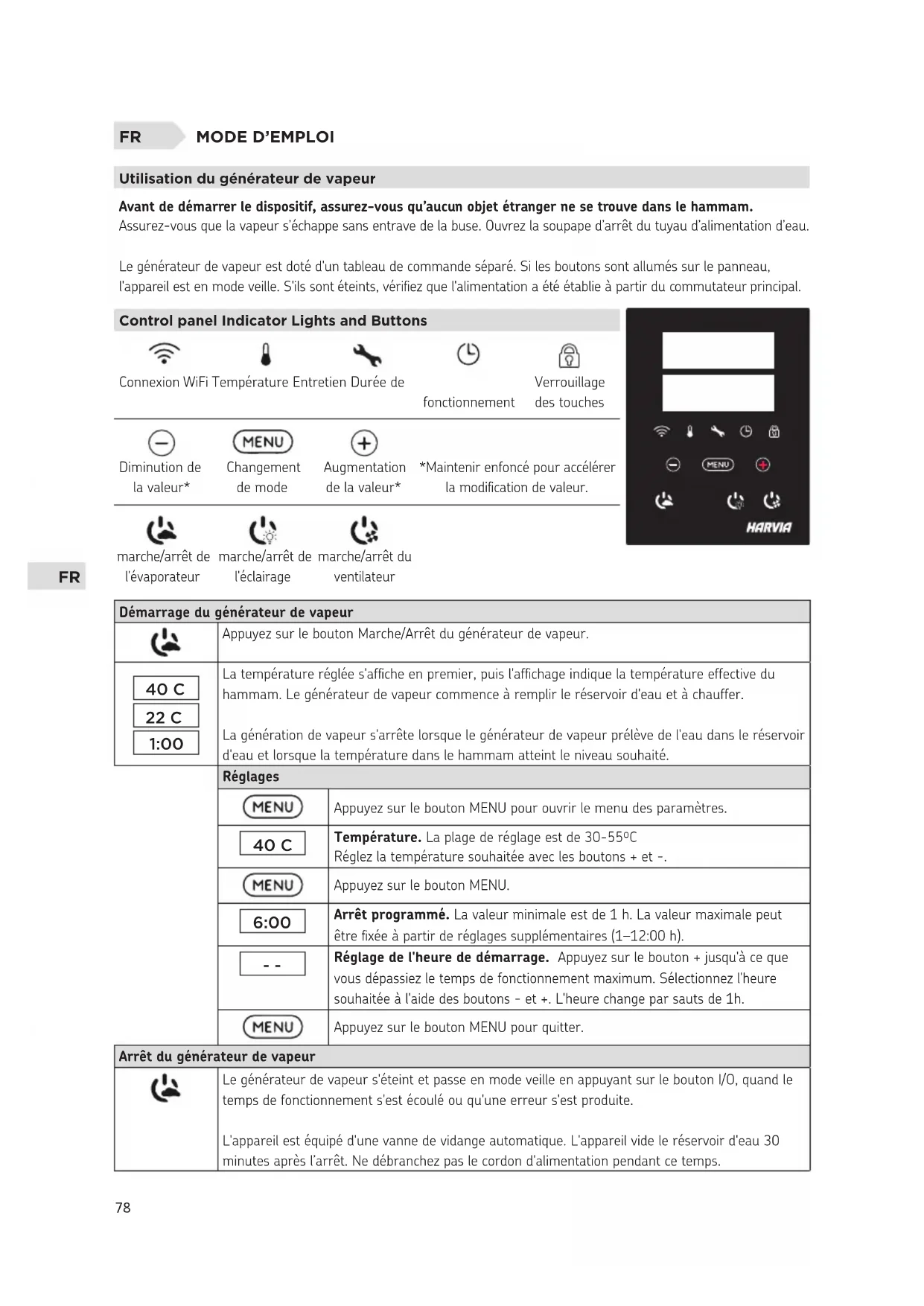 Réglage de l'heure de démarrage. Appuyez sur le bouton + jusqu'à ce que vous dépassiez le temps de fonctionnement maximum. Sélectionnez l'heure souhaitée à l'aide des boutons - et +. L'heure change par sauts de 1h. Appuyez sur le bouton MENU pour quitter. Arrêt du générateur de vapeur Le générateur de vapeur s'éteint et passe en mode veille en appuyant sur le bouton I/O, quand le temps de fonctionnement s'est écoulé ou qu'une erreur s'est produite. L'appareil est équipé d'une vanne de vidange automatique. L'appareil vide le réservoir d'eau 30 minutes après l’arrêt. Ne débranchez pas le cordon d'alimentation pendant ce temps.79