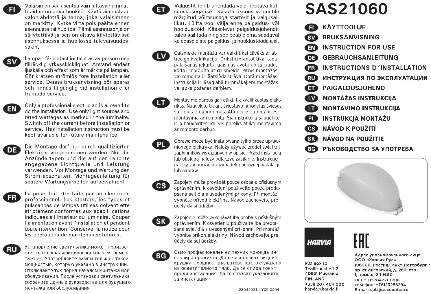 SAS21060 - Éclairage HARVIA - Notice d'utilisation et mode d'emploi gratuit