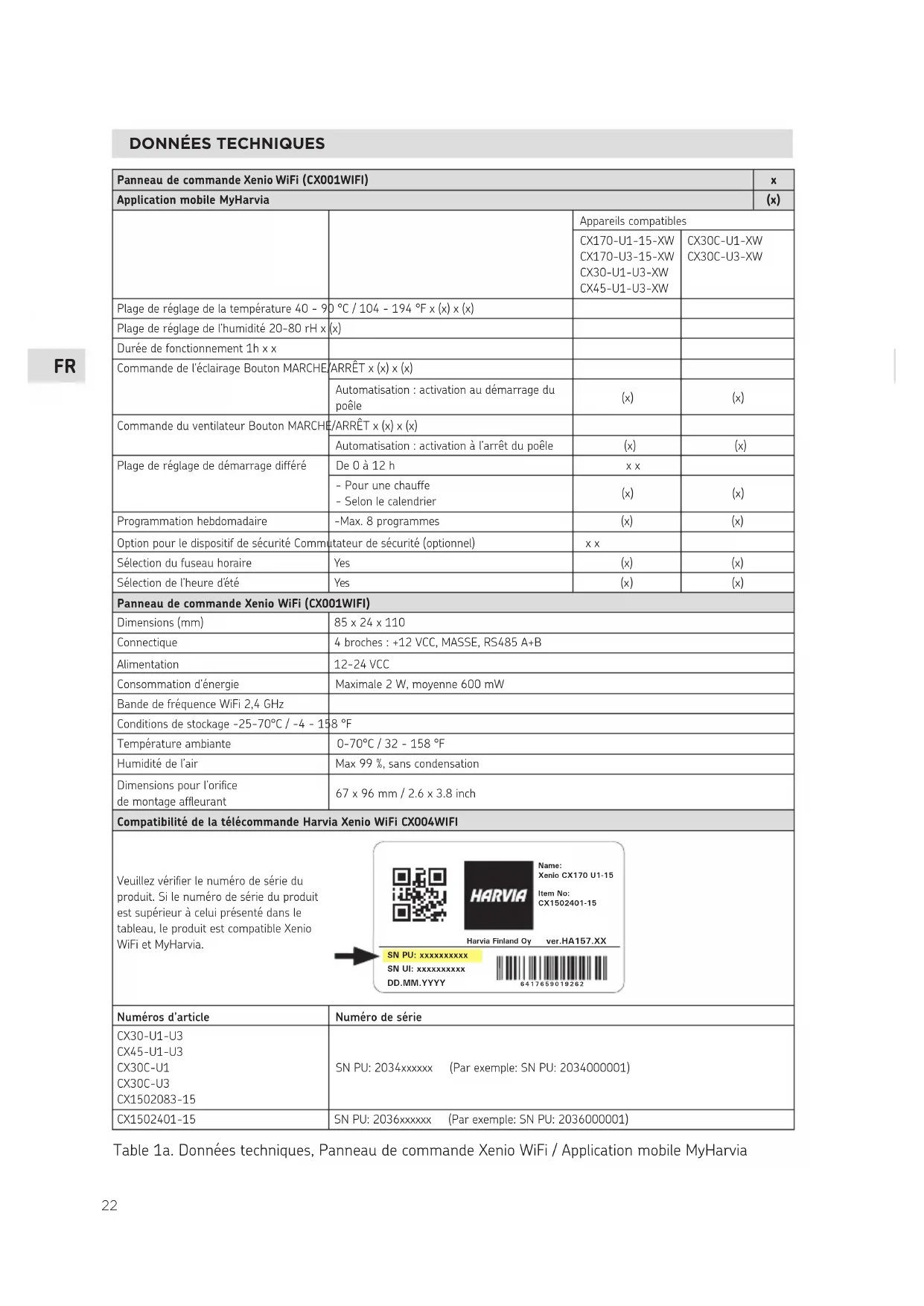 Table 1a. Données techniques, Panneau de commande Xenio WiFi / Application mobile MyHarvia Panneau de commande Xenio WiFi (CX001WIFI) x Application mobile MyHarvia (x) Appareils compatibles CX170-U1-15-XW CX170-U3-15-XW CX30-U1-U3-XW CX45-U1-U3-XW CX30C-U1-XW CX30C-U3-XW Plage de réglage de la température 40 - 90 °C / 104 - 194 °F x (x) x (x) Plage de réglage de l’humidité 20-80 rH x (x) Durée de fonctionnement 1h x x Commande de l’éclairage Bouton MARCHE/ARRÊT x (x) x (x) Automatisation : activation au démarrage du poêle (x) (x) Commande du ventilateur Bouton MARCHE/ARRÊT x (x) x (x) Automatisation : activation à l’arrêt du poêle (x) (x) Plage de réglage de démarrage différé De 0 à 12 h x x - Pour une chauffe - Selon le calendrier (x) (x) Programmation hebdomadaire -Max. 8 programmes (x) (x) Option pour le dispositif de sécurité Commutateur de sécurité (optionnel) x x Sélection du fuseau horaire Yes (x) (x) Sélection de l’heure d’été Yes (x) (x) Panneau de commande Xenio WiFi (CX001WIFI) Dimensions (mm) 85 x 24 x 110 Connectique 4 broches : +12 VCC, MASSE, RS485 A+B Alimentation 12-24 VCC Consommation d’énergie Maximale 2 W, moyenne 600 mW Bande de fréquence WiFi 2,4 GHz Conditions de stockage -25-70°C / -4 - 158 °F Température ambiante 0-70°C / 32 - 158 °F Humidité de l’air Max 99 %, sans condensation Dimensions pour l’orifice de montage affleurant 67 x 96 mm / 2.6 x 3.8 inch Compatibilité de la télécommande Harvia Xenio WiFi CX004WIFI Veuillez vérifier le numéro de série du produit. Si le numéro de série du produit est supérieur à celui présenté dans le tableau, le produit est compatible Xenio WiFi et MyHarvia. Harvia Finland OyName:Xenio CX170 U1-15Item No:CX1502401-15 ver.HA157.XX SN PU: xxxxxxxxxx SN UI: xxxxxxxxxx
