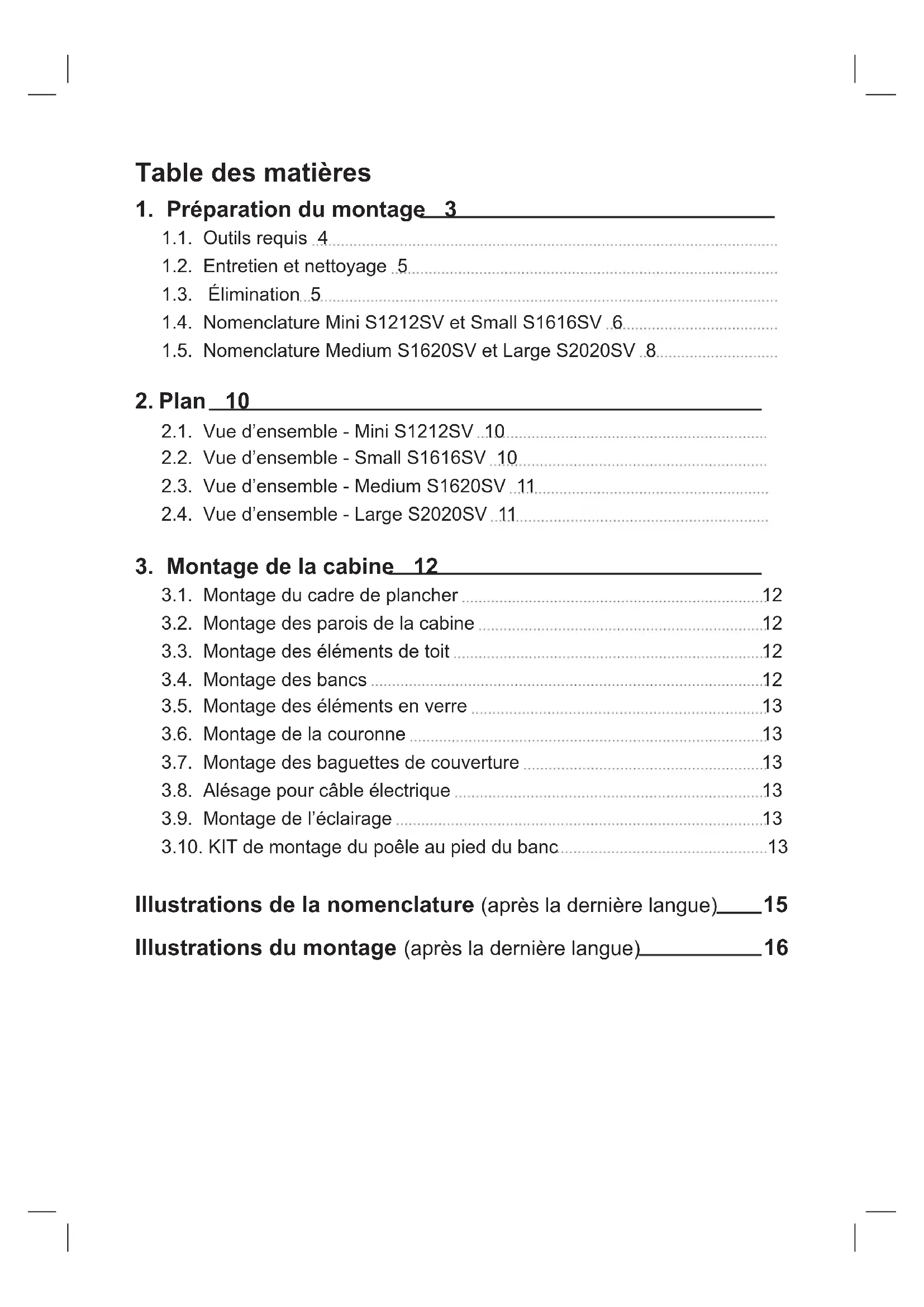 3.1. Montage du cadre de plancher 12 3.2. Montage des parois de la cabine 12 3.3. Montage des éléments de toit 12 3.4. Montage des bancs 12 3.5. Montage des éléments en verre 13 3.6. Montage de la couronne 13 3.7. Montage des baguettes de couverture 13 3.8. Alésage pour câble électrique 13 3.9. Montage de l’éclairage 13 3.10. KIT de montage du poêle au pied du banc 13 Illustrations de la nomenclature (après la dernière langue) 15 Illustrations du montage (après la dernière langue) 16FR Instructions de montage p. 3/14
