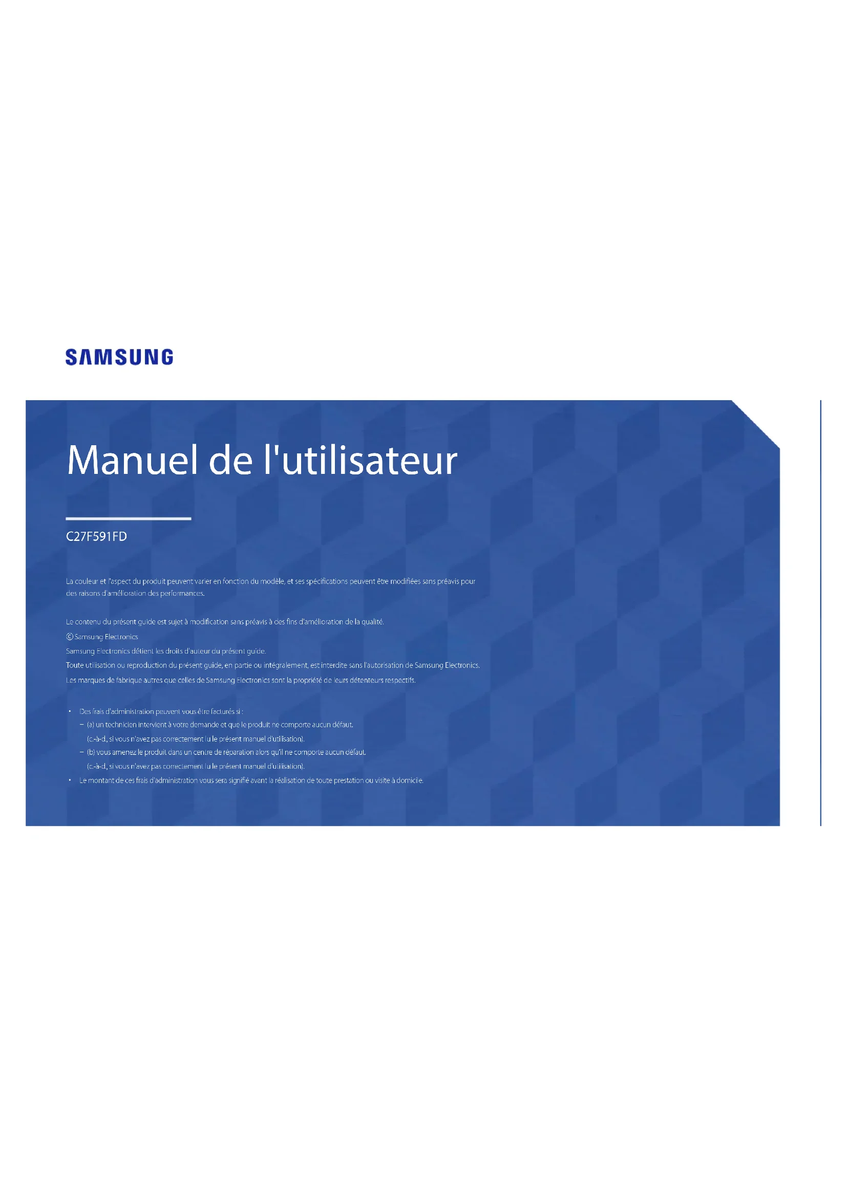 Samsung Electronics Samsung Electronics détient les droits d'auteur du présent guide. Toute utilisation ou reproduction du présent guide, en partie ou intégralement, est interdite sans l'autorisation de Samsung Electronics. Les marques de fabrique autres que celles de Samsung Electronics sont la propriété de leurs détenteurs respectifs. C27F591FD