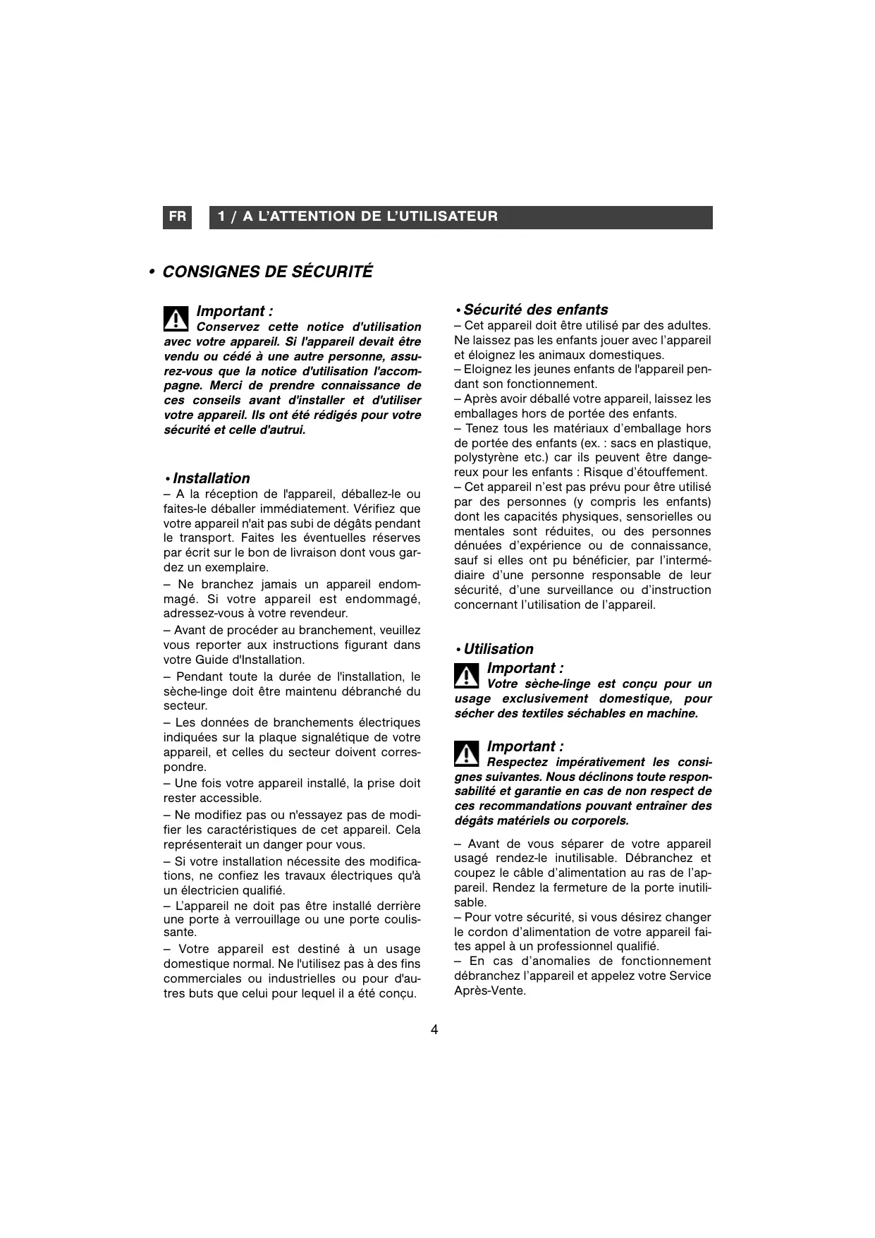 - Utilisation Important : Votre sèche-linge est conçu pour un usage exclusivement domestique, pour sécher des textiles séchables en machine. Important : Respectez impérativement les consignes suivantes. Nous déclinons toute responsabilité et garantie en cas de non respect de ces recommandations pouvant entraîner des dégâts matériels ou corporels. — Avant de vous séparer de votre appareil usagé rendez-le inutilisable. Débranchez et coupez le câble d’alimentation au ras de l’appareil. Rendez la fermeture de la porte inutilisable. — Pour votre sécurité, si vous désirez changer le cordon d’alimentation de votre appareil faites appel à un professionnel qualifié. — En cas d’anomalies de fonctionnement débranchez l’appareil et appelez votre Service Après-Vente.