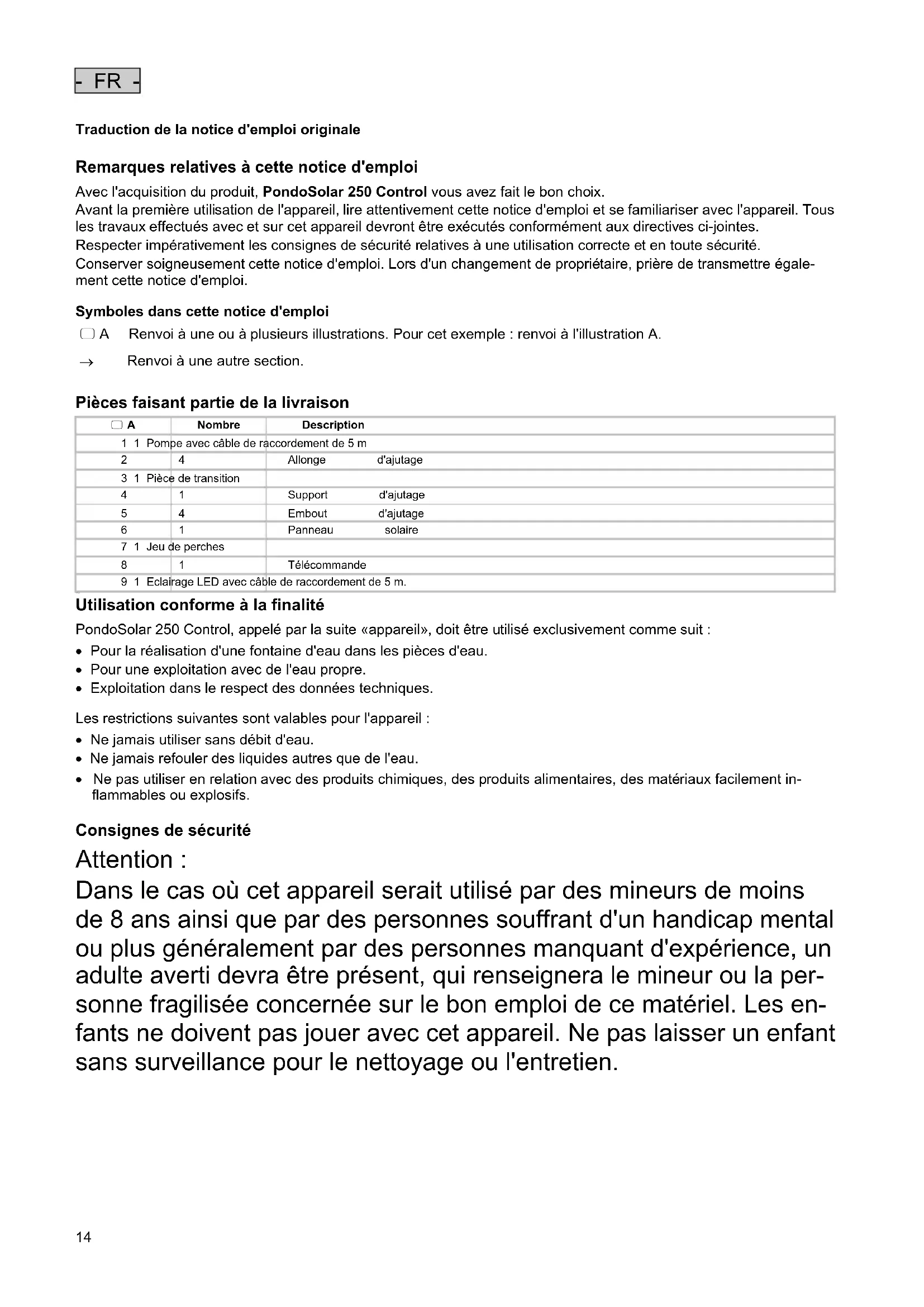 Remarques relatives à cette notice d'emploi Avec l'acquisition du produit, PondoSolar 250 Control vous avez fait le bon choix. Avant la première utilisation de l'appareil, lire attentivement cette notice d'emploi et se familiariser avec l'appareil. Tous les travaux effectués avec et sur cet appareil devront être exécutés conformément aux directives ci-jointes. Respecter impérativement les consignes de sécurité relatives à une utilisation correcte et en toute sécurité. Conserver soigneusement cette notice d'emploi. Lors d'un changement de propriétaire, prière de transmettre égale- ment cette notice d'emploi.