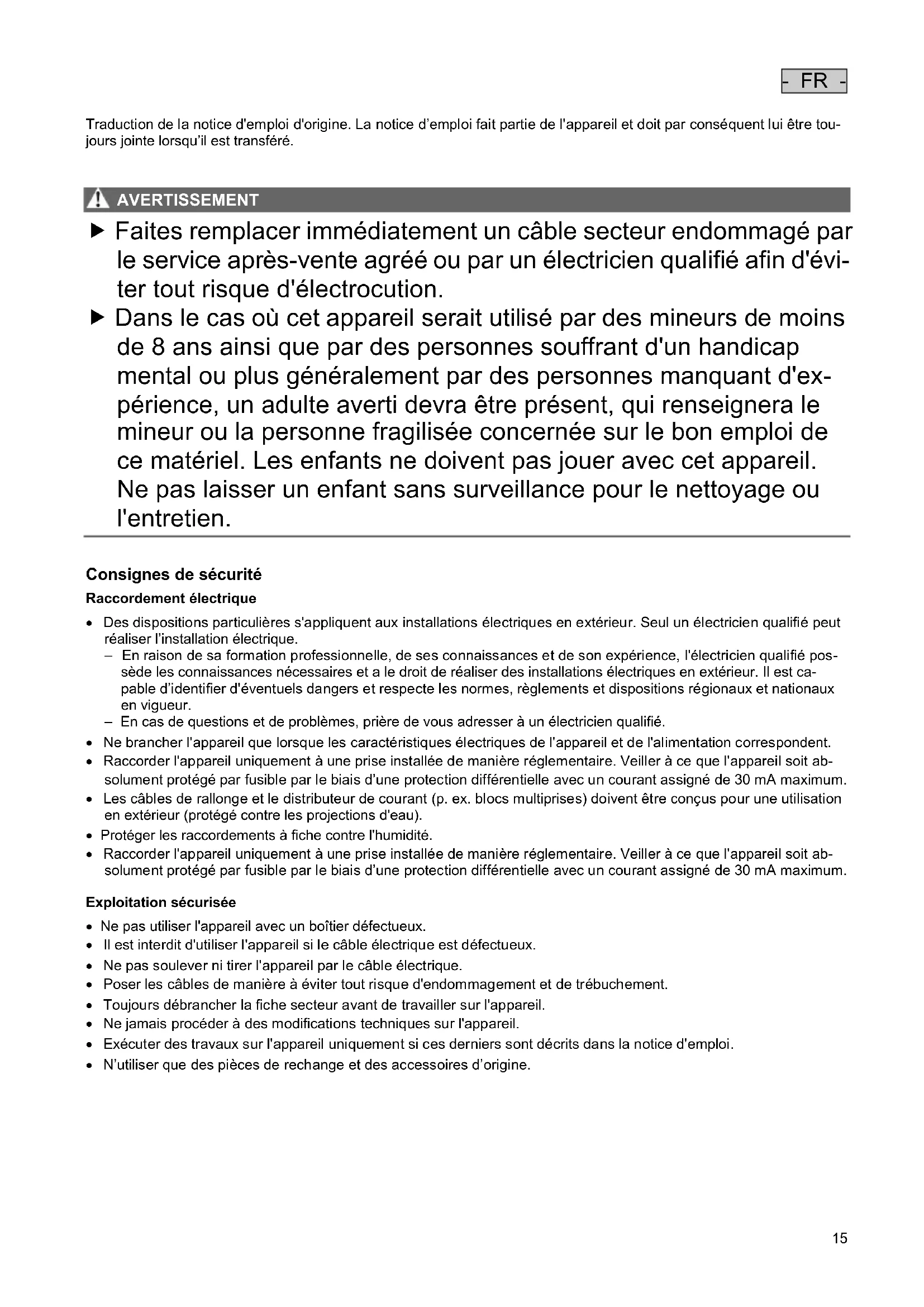 - FR - Traduction de la notice d'emploi d'origine. La notice d’emploi fait partie de l'appareil et doit par conséquent lui être tou- jours jointe lorsqu’il est transféré.
