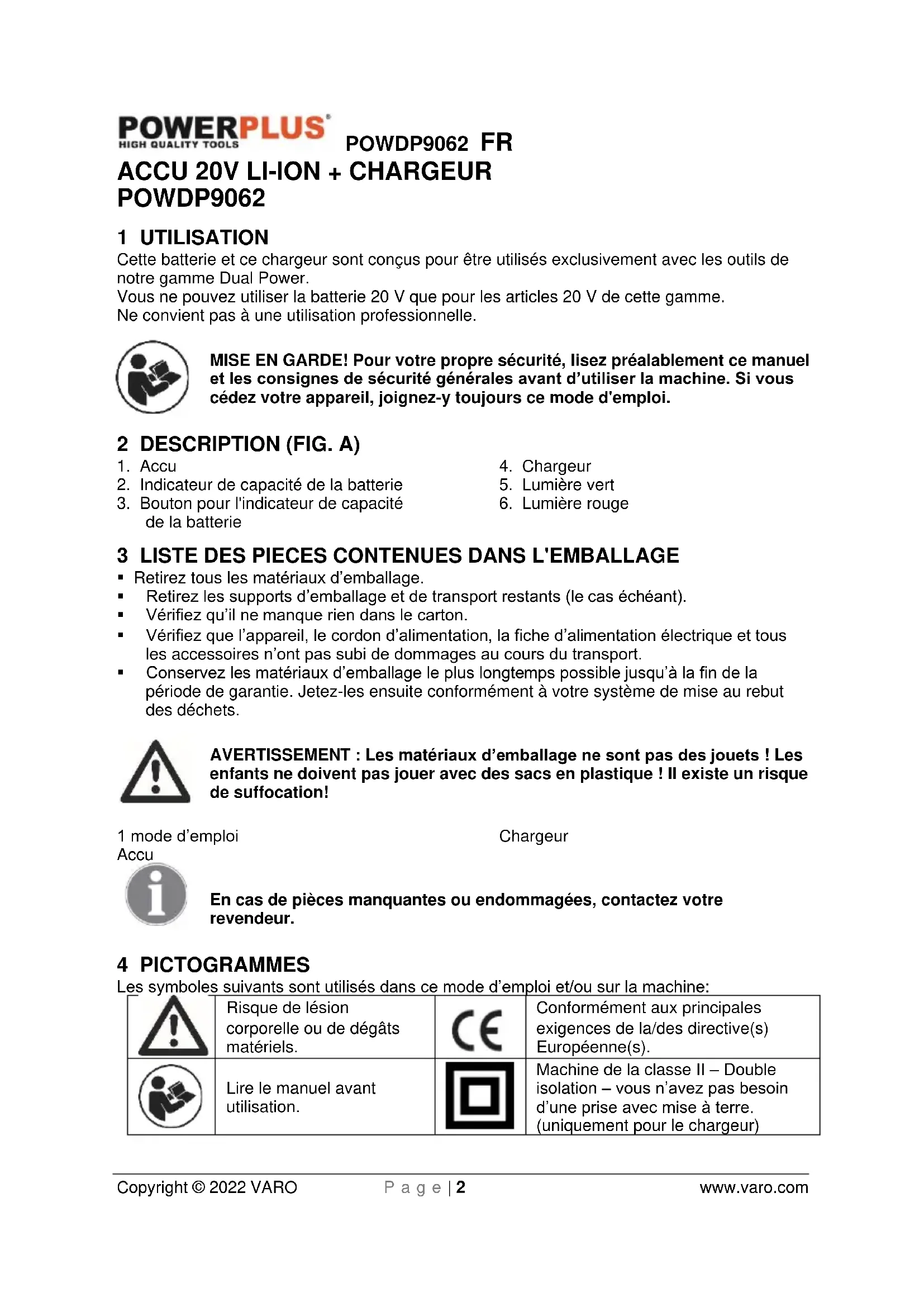 Machine de la classe II – Double isolation – vous n’avez pas besoin d’une prise avec mise à terre. (uniquement pour le chargeur)POWDP9062 FR Copyright © 2022 VARO P a g e | 3 www.varo.com