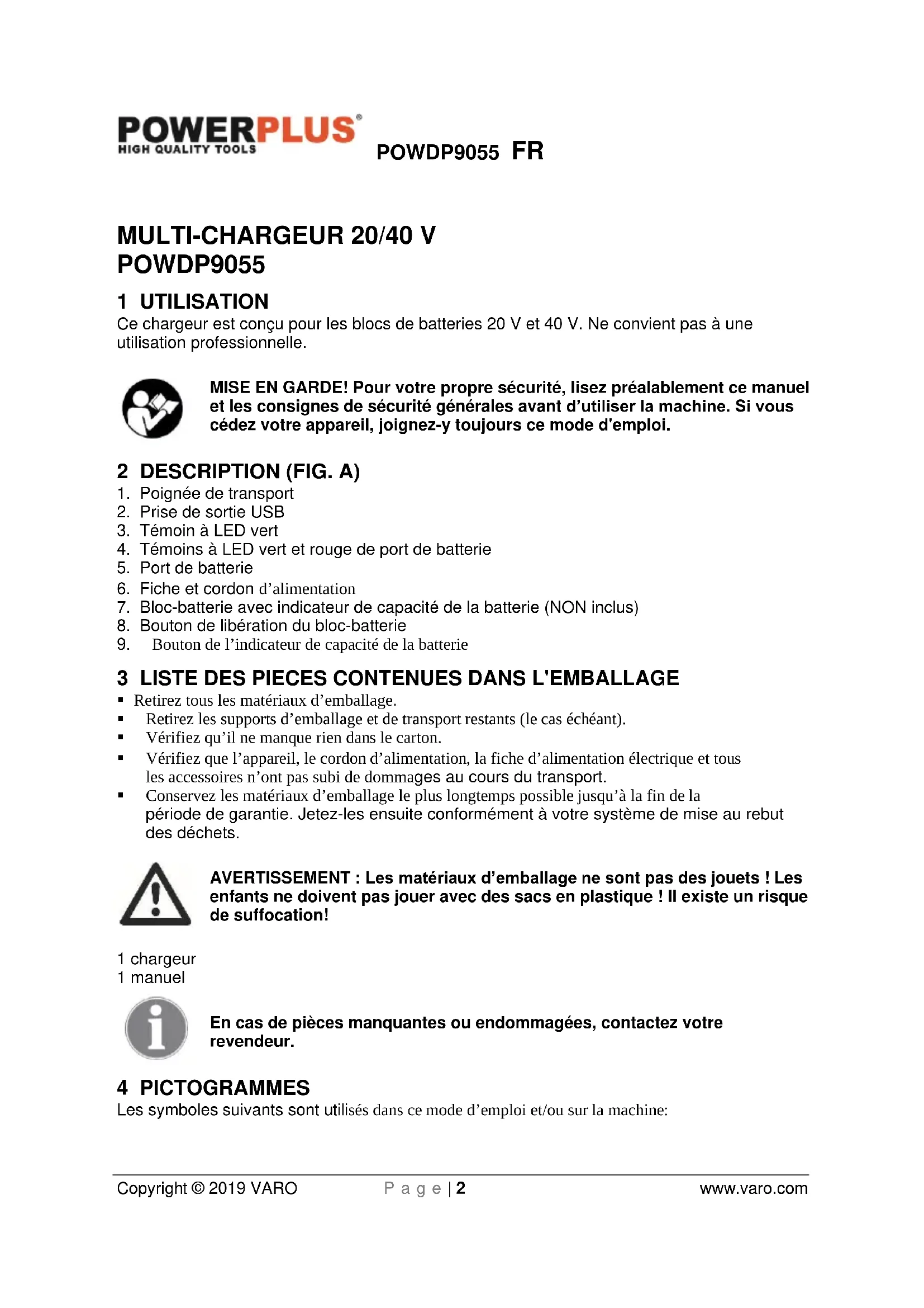 enfants ne doivent pas jouer avec des sacs en plastique ! Il existe un risque de suffocation! 1 chargeur 1 manuel En cas de pièces manquantes ou endommagées, contactez votre revendeur. 4 PICTOGRAMMES Les symboles suivants sont utilisés dans ce mode d’emploi et/ou sur la machine:POWDP9055 FR Copyright © 2019 VARO P a g e | 3 www.varo.com