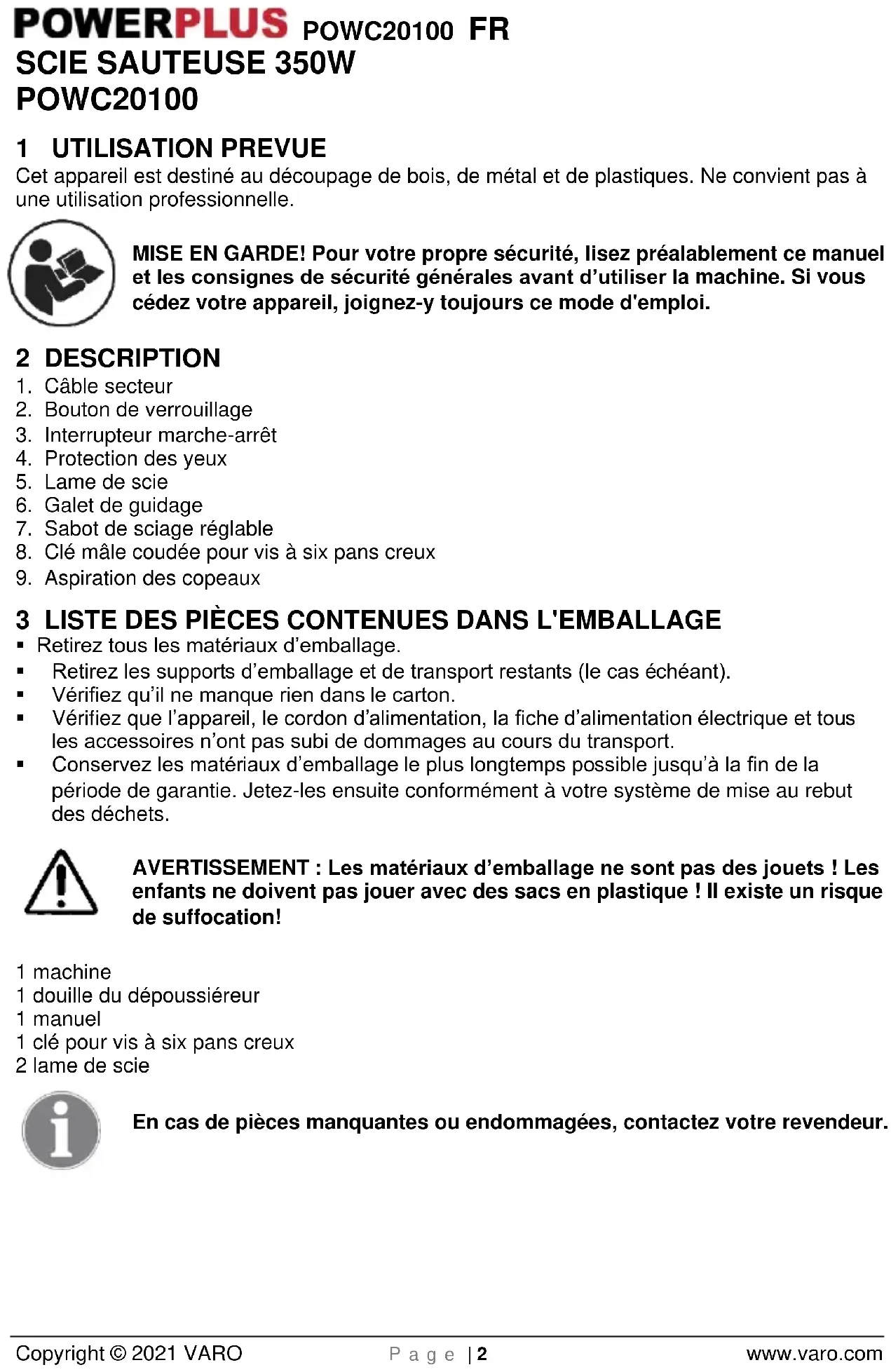 VARO – Vic. Van Rompuy N.V. - Joseph Van Instraat 9 - 2500 Lier - Belgique, déclare que : Appareil : Scie sauteuse Marque : POWERplus Modèle : POWC20100 est en conformité avec les exigences essentielles et les autres dispositions pertinentes des Directives européennes applicables, basées sur l'application des normes européennes harmonisées. Toute modification non autorisée de l'appareil annule cette déclaration. Directives européennes (y compris, le cas échéant, leurs amendements à la date de la signature) : 2011/65/EU 2006/42/EC 2014/30/EC Normes européennes harmonisées (y compris, le cas échéant, leurs amendements à la date de la signature) : EN60745-1 : 2009 EN60745-2-11 : 2010 EN55014-1 : 2006 EN55014-2 : 2015 EN61000-3-2 : 2014 EN61000-3-3 : 2013 Détenteur de la Documentation technique : Philippe Vankerkhove, VARO – Vic. Van Rompuy N.V. Le soussigné agit au nom du PDG de l'entreprise, Philippe Vankerkhove Réglementation – Directeur de la conformité 12/11/2020, Lier - BelgiumPOWC20100 EN Copyright © 2021 VARO P a g e | 1 www.varo.com 1 INTENDED USE ................................................................................. 2 2 DESCRIPTION ................................................................................... 2