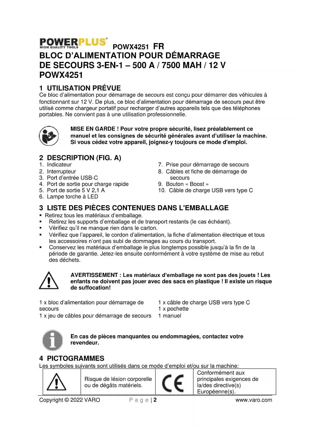 5 V / 3 A, 9 V / 2 A 5 V / 2,1 A 12 V Courant de démarrage 200 A Courant de crête 500 A Désactivation automatique Oui Températures de service -20 °C ~ 60 °C 9 ENVIRONNEMENT Si, après un certain temps, vous décidez de remplacer votre machine, ne vous en débarrassez pas avec les ordures ménagères, mais destinez-la à un traitement respectueux de l'environnement. Les déchets électriques ne peuvent être traités de la même manière que les ordures ménagères ordinaires. Procédez à leur recyclage, là où il existe des installations adéquates. Renseignez-vous à propos des procédés de collecte et de traitement auprès des autorités locales compétentes ou de votre revendeur.POWX4251 FR Copyright © 2022 VARO P a g e | 8 www.varo.com