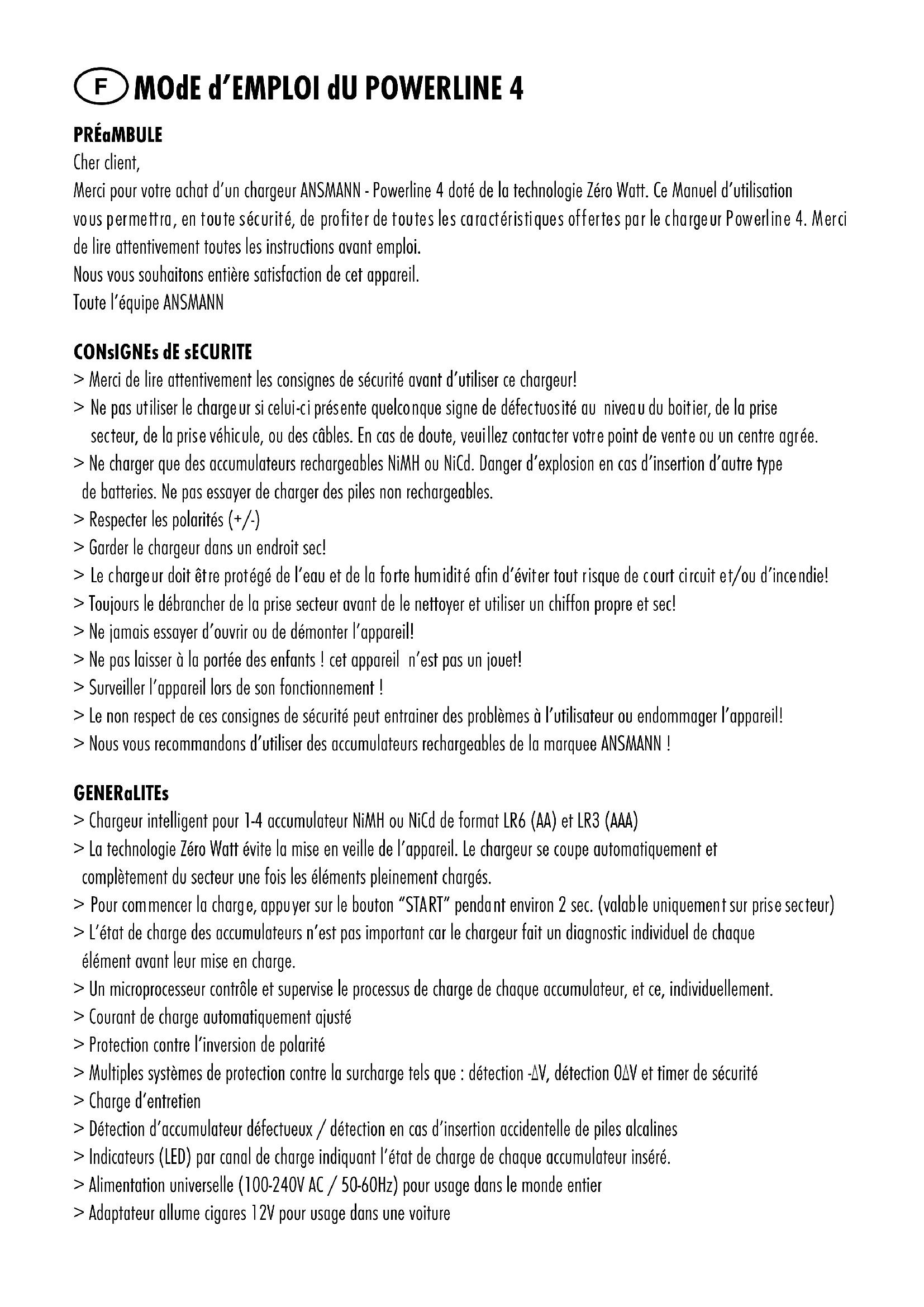 Powerline 4 Zero Watt - Chargeur de piles ANSMANN - Notice d'utilisation et mode d'emploi gratuit