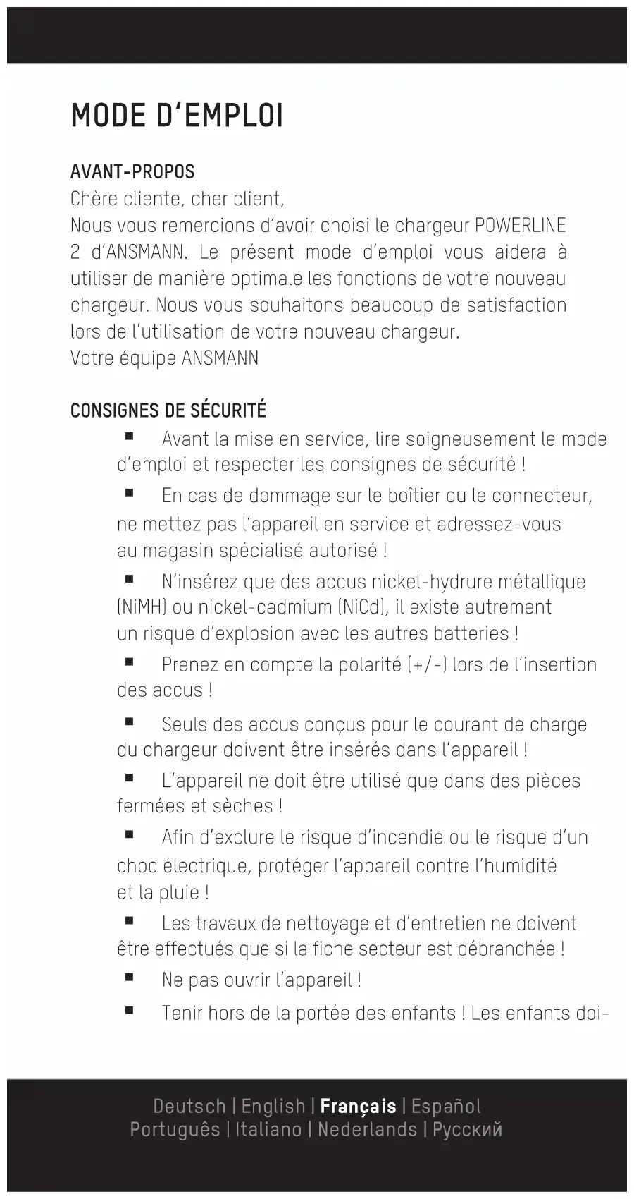 Avant la mise en service, lire soigneusement le mode d‘emploi et respecter les consignes de sécurité ! En cas de dommage sur le boîtier ou le connecteur, ne mettez pas l‘appareil en service et adressez-vous au magasin spécialisé autorisé ! N‘insérez que des accus nickel-hydrure métallique (NiMH) ou nickel-cadmium (NiCd), il existe autrement un risque d‘explosion avec les autres batteries ! Prenez en compte la polarité (+/-) lors de l‘insertion des accus ! Seuls des accus conçus pour le courant de charge du chargeur doivent être insérés dans l‘appareil ! L‘appareil ne doit être utilisé que dans des pièces fermées et sèches ! Afin d‘exclure le risque d‘incendie ou le risque d‘un choc électrique, protéger l‘appareil contre l‘humidité et la pluie ! Les travaux de nettoyage et d‘entretien ne doivent être effectués que si la fiche secteur est débranchée ! Ne pas ouvrir l‘appareil ! Tenir hors de la portée des enfants ! Les enfants doi- Deutsch | English | Français | Español Português | Italiano | Nederlands | Pусскийvent être surveillés afin de s‘assurer qu‘ils ne jouent pas avec l‘appareil ! Cet appareil n‘est pas conçu pour une utilisation par des personnes (y compris par des enfants) avec des capa- cités corporelles, sensorielles ou intellectuelles limitées ou avec une absence d‘expérience et de connaissan- ces concernant la manipulation de cet appareil. Ces personnes doivent être préalablement instruites par une personne de surveillance responsable de leur sécurité ou doivent être surveillées pendant l‘utilisation de l‘appareil ! Le non respect des consignes de sécurité peut causer des dommages sur l‘appareil, les accus ou entraîner des blessures graves ! Nous recommandons l‘utilisation d‘accus ANSMANN !