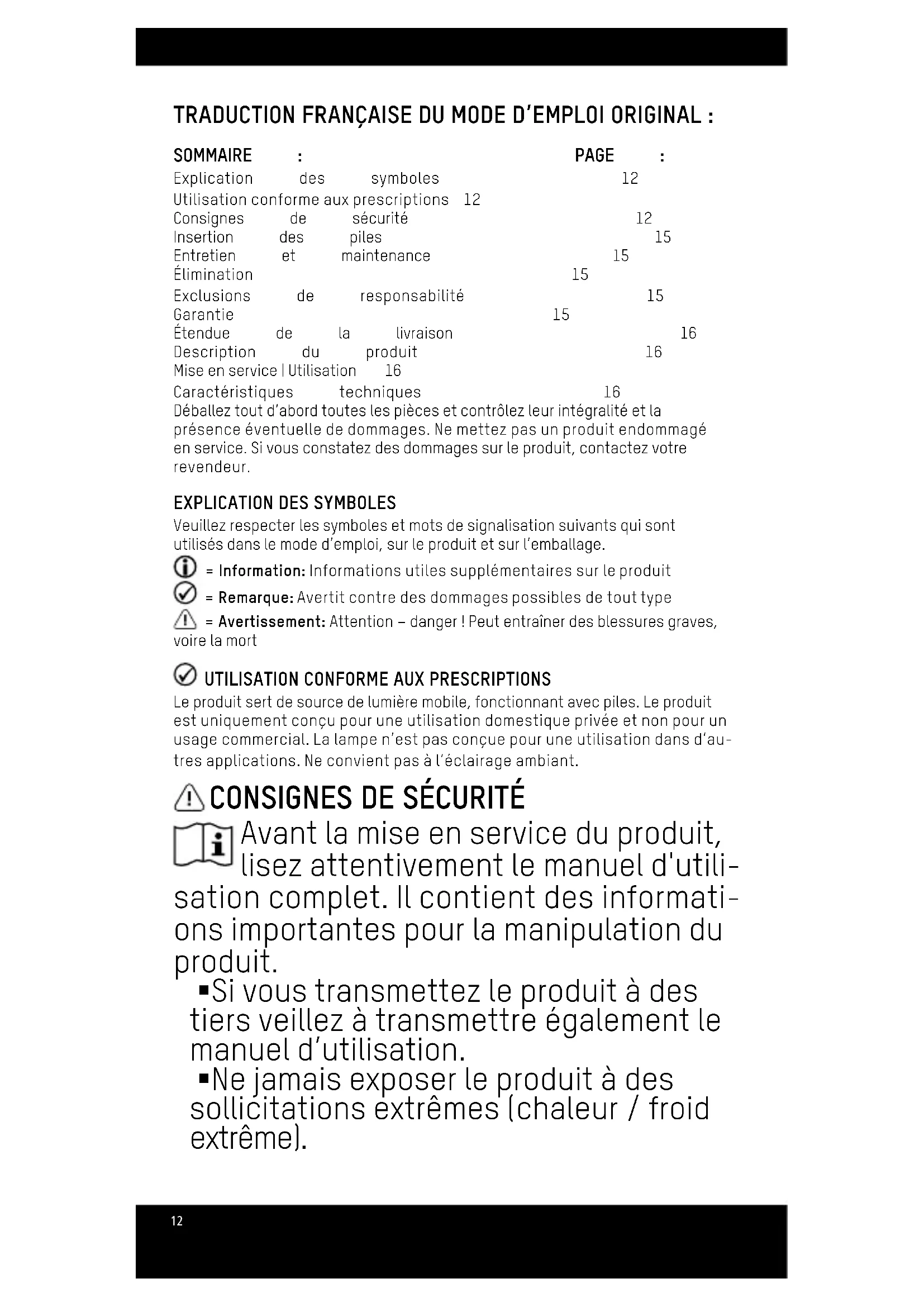 Attention : §Ce produit contient des piles. Ne jetez pas le produit au feu §Les piles installées incorrectement peu- vent présenter une fuite et / ou causer un incendie / une explosion §Toujours remplacer le jeu complet de piles, toujours utiliser des piles de même qualité §Tenir les piles hors de la portée des enfants : risque d’ingestion ou de suffo- cation §Ne jamais tenter d’ouvrir, d’écraser, de chauffer ou de mettre en feu une pile §N’utilisez pas les piles si le produit sem- ble endommagé §Piles non rechargeables §Éliminez toujours les piles / batteries usées conformément aux lois ou exigen- ces locales. §Si les piles fuient, ne les touchez pas. Si vous touchez du liquide de batterie, lavez immédiatement l’emplacement concerné abondamment à l’eau §Si le liquide de batterie cause une réac- tion cutanée ou entre en contact avec les yeux, consultez immédiatement un médecin §Ne pas court-circuiter les piles ! §L'utilisation d'accus et de piles pour courant intense n'est pas autorisée en raison des valeurs électriques différen- tes.15 §Retirez immédiatement de la lampe les batteries usées ou vides §Si la lampe ne doit plus être utilisée, retirez les piles de la lampe avant son élimination