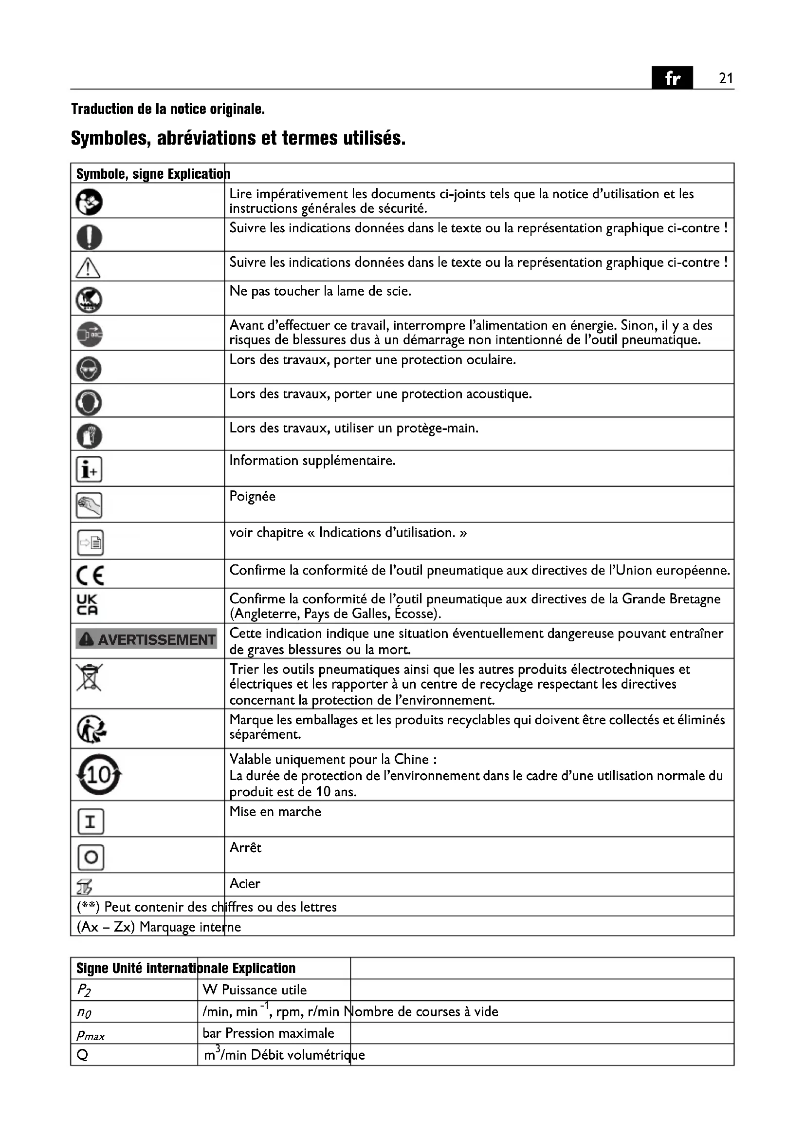 Traduction de la notice originale. Symboles, abréviations et termes utilisés. Symbole, signe Explication Lire impérativement les documents ci-joints tels que la notice d’utilisation et les instructions générales de sécurité. Suivre les indications données dans le texte ou la représentation graphique ci-contre ! Suivre les indications données dans le texte ou la représentation graphique ci-contre ! Ne pas toucher la lame de scie. Avant d’effectuer ce travail, interrompre l’alimentation en énergie. Sinon, il y a des risques de blessures dus à un démarrage non intentionné de l’outil pneumatique. Lors des travaux, porter une protection oculaire. Lors des travaux, porter une protection acoustique. Lors des travaux, utiliser un protège-main. Information supplémentaire. Poignée voir chapitre « Indications d’utilisation. » Confirme la conformité de l’outil pneumatique aux directives de l’Union européenne. Confirme la conformité de l’outil pneumatique aux directives de la Grande Bretagne (Angleterre, Pays de Galles, Écosse). Cette indication indique une situation éventuellement dangereuse pouvant entraîner de graves blessures ou la mort. Trier les outils pneumatiques ainsi que les autres produits électrotechniques et électriques et les rapporter à un centre de recyclage respectant les directives concernant la protection de l’environnement. Marque les emballages et les produits recyclables qui doivent être collectés et éliminés séparément. Valable uniquement pour la Chine : La durée de protection de l’environnement dans le cadre d’une utilisation normale du produit est de 10 ans. Mise en marche Arrêt Acier (**) Peut contenir des chiffres ou des lettres (Ax – Zx) Marquage interne AVERTISSEMENT Signe Unité internationale Explication