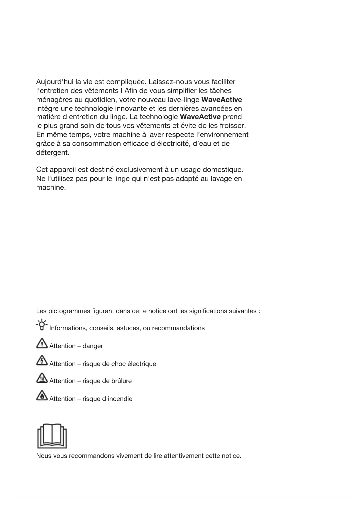 POUR LAVE-LINGE www.gorenje.com 801589fr.indd 1801589fr.indd 1 24. 02. 2021 10:40:3924. 02. 2021 10:40:39Aujourd'hui la vie est compliquée. Laissez-nous vous faciliter l'entretien des vêtements ! Afin de vous simplifier les tâches ménagères au quotidien, votre nouveau lave-linge WaveActive intègre une technologie innovante et les dernières avancées en matière d'entretien du linge. La technologie WaveActive prend le plus grand soin de tous vos vêtements et évite de les froisser. En même temps, votre machine à laver respecte l’environnement grâce à sa consommation efficace d'électricité, d’eau et de détergent. Cet appareil est destiné exclusivement à un usage domestique. Ne l'utilisez pas pour le linge qui n'est pas adapté au lavage en machine. Les pictogrammes figurant dans cette notice ont les significations suivantes : Informations, conseils, astuces, ou recommandations Attention – danger Attention – risque de choc électrique Attention – risque de brûlure Attention – risque d'incendie Nous vous recommandons vivement de lire attentivement cette notice. 801589fr.indd 2801589fr.indd 2 24. 02. 2021 10:40:5024. 02. 2021 10:40:50801589