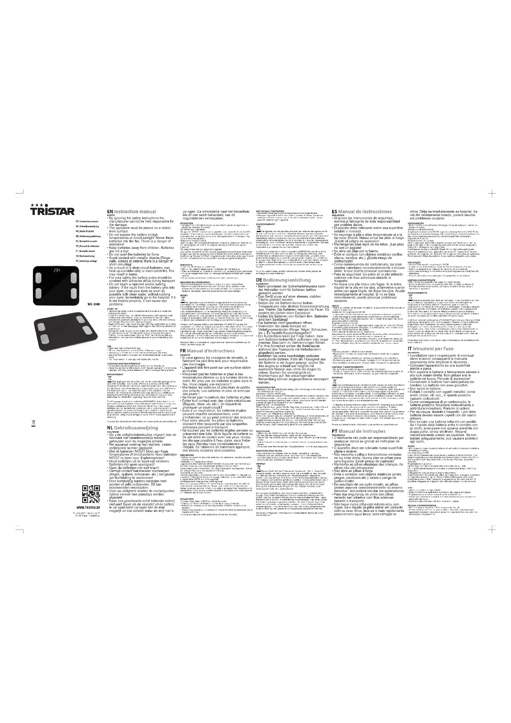 - Ne touchez pas les batteries et piles percées ou présentant une fuite. Si du liquide de batterie ou de pile entre en contact avec vos yeux, rincez- les dès que possible à l'eau claire, sans frotter les yeux. Rendez-vous immédiatement à l'hôpital. En l'absence de traitement approprié, des lésions oculaires sont possibles. DÉMARRAGE• Retirez le couvercle des piles situé sous la balance et installez les piles(3piles AAA).Installation de l'application OKOKL'application internationale OKOK fonctionne aussi bien sur Android quesur iOS. Vous pouvez la télécharger gratuitement sur http://www.tookok.cn/download.html, sur l'AppStore (pour les appareils iOS) ousur GooglePlay (pour les appareils Android).Inscription et connexionOuvrez l'application, remplissez le formulaire d'inscription en cliquant sur«Join Us» (Rejoignez-nous) sur la page principale, puis connectez-vousà l'application OKOK sur votre appareil.Jumelage de la balance avec votre appareilAssurez-vous que le Bluetooth est activé sur votre appareil. Jumelez labalance avec votre appareil en cliquant sur «Device» (Dispositif) surl'écran principal, puis sur «Pair» (Jumeler), en suivant les instructions del'application. Vous pouvez jumeler plusieurs dispositifs avec votre appareilen n'utilisant qu'un seul compte.UTILISATION• Ouvrez l'application OKOK et connectez-vous.• Cliquez sur l'icône de balance en bas de la page principale.• Retirez vos chaussures et vos chaussettes avant de monter sur labalance.• Tenez-vous debout sur la balance et restez immobile en attendant que lamesure soit prise.• L'écran principal de votre application affiche les résultats.NETTOYAGE ET ENTRETIEN• Ne jamais immerger l’appareil dans l’eau ou tout autre liquide.• Nettoyez l'appareil à l'aide d'un chiffon humide. N'utilisez jamais denettoyant abrasif ni de tampon à récurer ou de laine d'acier, ce quipourrait endommager l'appareil.ENVIRONNEMENTCet appareil ne doit pas être jeté avec les ordures ménagères en finde vie, mais remis à un endroit centralisé de recyclage des appareilsélectriques et électroniques. Le symbole sur l'appareil, le mode d’emploi etl'emballage, attire votre attention sur ce point important. Les matériauxutilisés dans cet appareil peuvent être recyclés. En recyclant les appareilsdomestiques, vous contribuez de façon importante à la protection de notreenvironnement. Consultez les autorités locales pour obtenir desinformations concernant le point de collecte.La Directive européenne relative aux piles (2006/66/CE) stipule qu'il estinterdit de jeter les piles avec les ordures ménagères. Elles peuventcontenir des substances nocives pour l'environnement. Les piles videspeuvent être remises à un point de collecte public local ou à un centre derecyclage local. Pour éviter une surchauffe due à un court-circuit, les pilesau lithium doivent être retirées du produit et les pôles doivent êtreprotégés contre les courts-circuits par un ruban isolant ou tout autremoyen.Vous trouverez toutes les informations disponibles et les pièces derechange sur www.tristar.eu! DEBedienungsanleitung SICHERHEIT