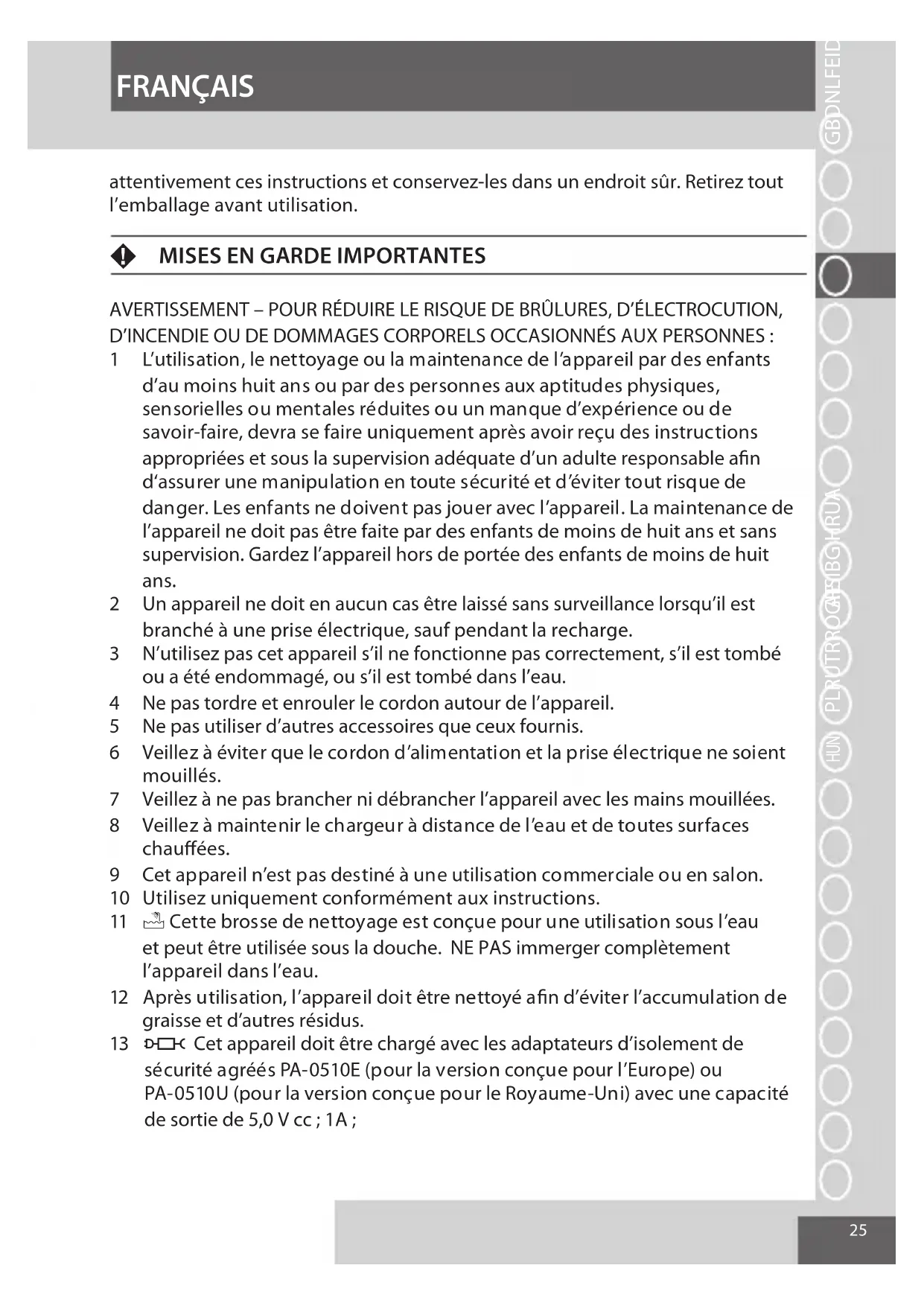 AVERTISSEMENT – POUR RÉDUIRE LE RISQUE DE BRÛLURES, D’ÉLECTROCUTION, D’INCENDIE OU DE DOMMAGES CORPORELS OCCASIONNÉS AUX PERSONNES : 1 L’utilisation, le nettoyage ou la maintenance de l’appareil par des enfants d’au moins huit ans ou par des personnes aux aptitudes physiques, sensorielles ou mentales réduites ou un manque d’expérience ou de savoir-faire, devra se faire uniquement après avoir reçu des instructions appropriées et sous la supervision adéquate d’un adulte responsable afin d‘assurer une manipulation en toute sécurité et d’éviter tout risque de danger. Les enfants ne doivent pas jouer avec l’appareil. La maintenance de l’appareil ne doit pas être faite par des enfants de moins de huit ans et sans supervision. Gardez l’appareil hors de portée des enfants de moins de huit ans. 2 Un appareil ne doit en aucun cas être laissé sans surveillance lorsqu’il est branché à une prise électrique, sauf pendant la recharge. 3 N’utilisez pas cet appareil s’il ne fonctionne pas correctement, s’il est tombé ou a été endommagé, ou s’il est tombé dans l’eau. 4 Ne pas tordre et enrouler le cordon autour de l’appareil. 5 Ne pas utiliser d’autres accessoires que ceux fournis. 6 Veillez à éviter que le cordon d’alimentation et la prise électrique ne soient mouillés. 7 Veillez à ne pas brancher ni débrancher l’appareil avec les mains mouillées. 8 Veillez à maintenir le chargeur à distance de l’eau et de toutes surfaces chauffées. 9 Cet appareil n’est pas destiné à une utilisation commerciale ou en salon. 10 Utilisez uniquement conformément aux instructions. 11 E Cette brosse de nettoyage est conçue pour une utilisation sous l’eau et peut être utilisée sous la douche. NE PAS immerger complètement l’appareil dans l’eau. 12 Après utilisation, l’appareil doit être nettoyé afin d’éviter l’accumulation de graisse et d’autres résidus.