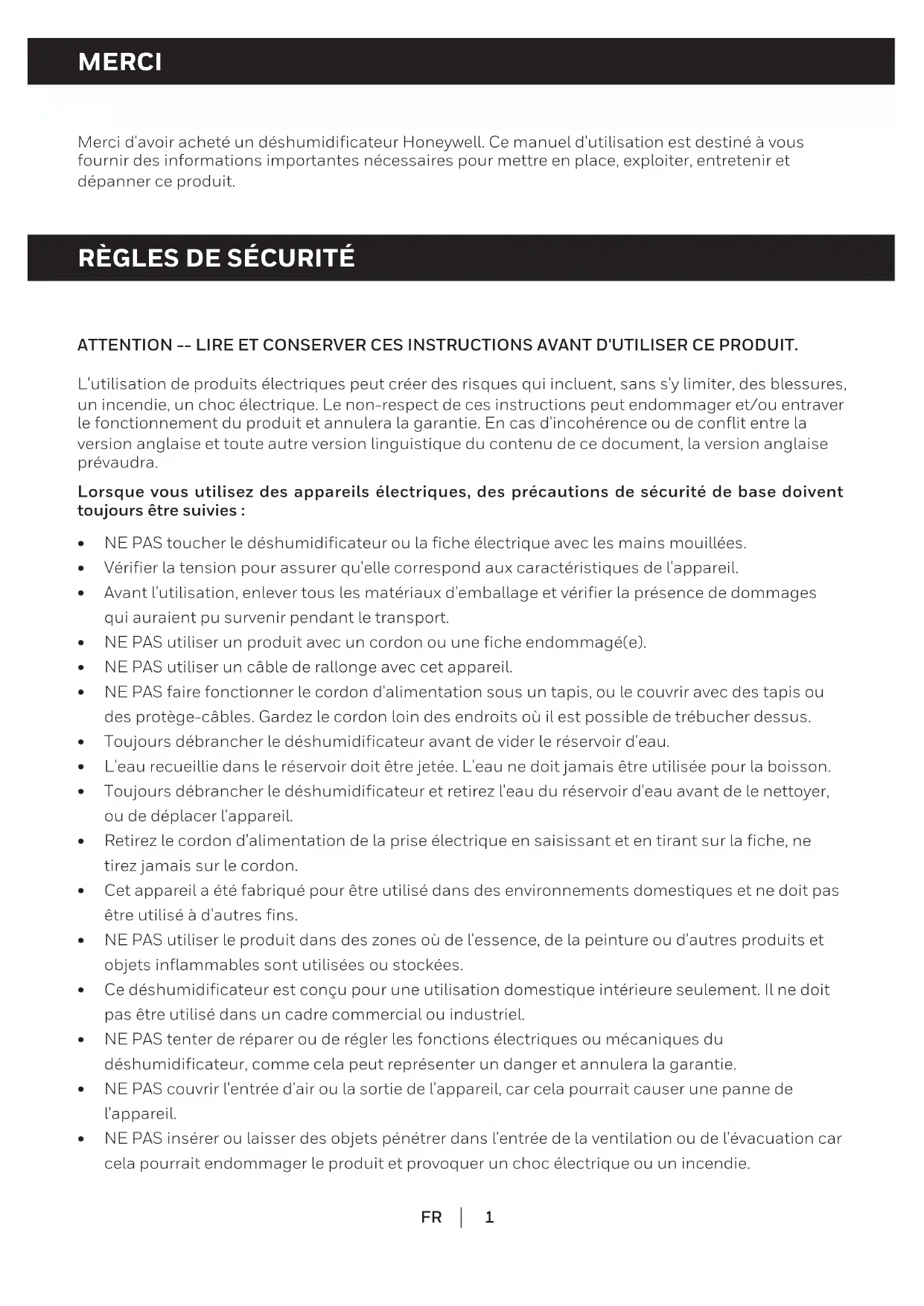 Merci d'avoir acheté un déshumidificateur Honeywell. Ce manuel d'utilisation est destiné à vous fournir des informations importantes nécessaires pour mettre en place, exploiter, entretenir et dépanner ce produit. ATTENTION -- LIRE ET CONSERVER CES INSTRUCTIONS AVANT D'UTILISER CE PRODUIT. L'utilisation de produits électriques peut créer des risques qui incluent, sans s'y limiter, des blessures, un incendie, un choc électrique. Le non-respect de ces instructions peut endommager et/ou entraver le fonctionnement du produit et annulera la garantie. En cas d'incohérence ou de conflit entre la version anglaise et toute autre version linguistique du contenu de ce document, la version anglaise prévaudra. Lorsque vous utilisez des appareils électriques, des précautions de sécurité de base doivent toujours être suivies :