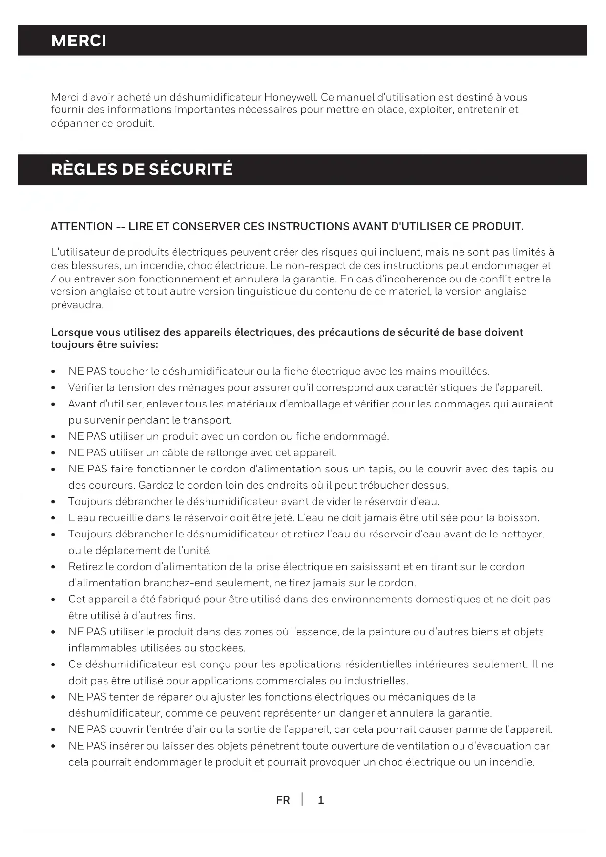 Merci d'avoir acheté un déshumidificateur Honeywell. Ce manuel d'utilisation est destiné à vous fournir des informations importantes nécessaires pour mettre en place, exploiter, entretenir et dépanner ce produit. ATTENTION -- LIRE ET CONSERVER CES INSTRUCTIONS AVANT D'UTILISER CE PRODUIT. L'utilisateur de produits électriques peuvent créer des risques qui incluent, mais ne sont pas limités à des blessures, un incendie, choc électrique. Le non-respect de ces instructions peut endommager et / ou entraver son fonctionnement et annulera la garantie. En cas d'incoherence ou de conflit entre la version anglaise et tout autre version linguistique du contenu de ce materiel, la version anglaise prévaudra. Lorsque vous utilisez des appareils électriques, des précautions de sécurité de base doivent toujours être suivies: