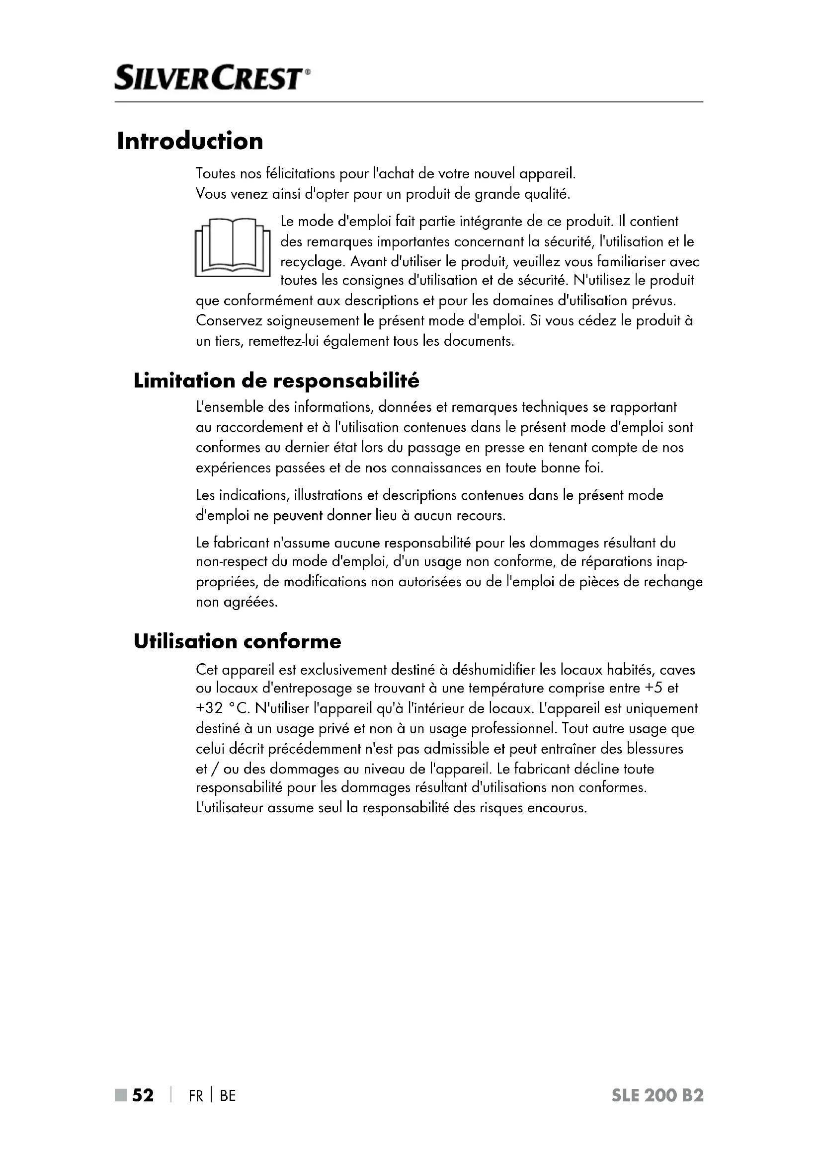 SLE 200 B2 Introduction Toutes nos félicitations pour l'achat de votre nouvel appareil. Vous venez ainsi d'opter pour un produit de grande qualité. Le mode d'emploi fait partie intégrante de ce produit. Il contient des remarques importantes concernant la sécurité, l'utilisation et le recyclage. Avant d'utiliser le produit, veuillez vous familiariser avec toutes les consignes d'utilisation et de sécurité. N'utilisez le produit que conformément aux descriptions et pour les domaines d'utilisation prévus. Conservez soigneusement le présent mode d'emploi. Si vous cédez le produit à un tiers, remettez-lui également tous les documents. Limitation de responsabilité L'ensemble des informations, données et remarques techniques se rapportant au raccordement et à l'utilisation contenues dans le présent mode d'emploi sont conformes au dernier état lors du passage en presse en tenant compte de nos expériences passées et de nos connaissances en toute bonne foi. Les indications, illustrations et descriptions contenues dans le présent mode d'emploi ne peuvent donner lieu à aucun recours. Le fabricant n'assume aucune responsabilité pour les dommages résultant du non-respect du mode d'emploi, d'un usage non conforme, de réparations inap- propriées, de modifications non autorisées ou de l'emploi de pièces de rechange non agréées. Utilisation conforme Cet appareil est exclusivement destiné à déshumidifier les locaux habités, caves ou locaux d'entreposage se trouvant à une température comprise entre +5 et +32°C. N'utiliser l'appareil qu'à l'intérieur de locaux. L'appareil est uniquement destiné à un usage privé et non à un usage professionnel. Tout autre usage que celui décrit précédemment n'est pas admissible et peut entraîner des blessures et / ou des dommages au niveau de l'appareil. Le fabricant décline toute responsabilité pour les dommages résultant d'utilisations non conformes. L'utilisateur assume seul la responsabilité des risques encourus.FR