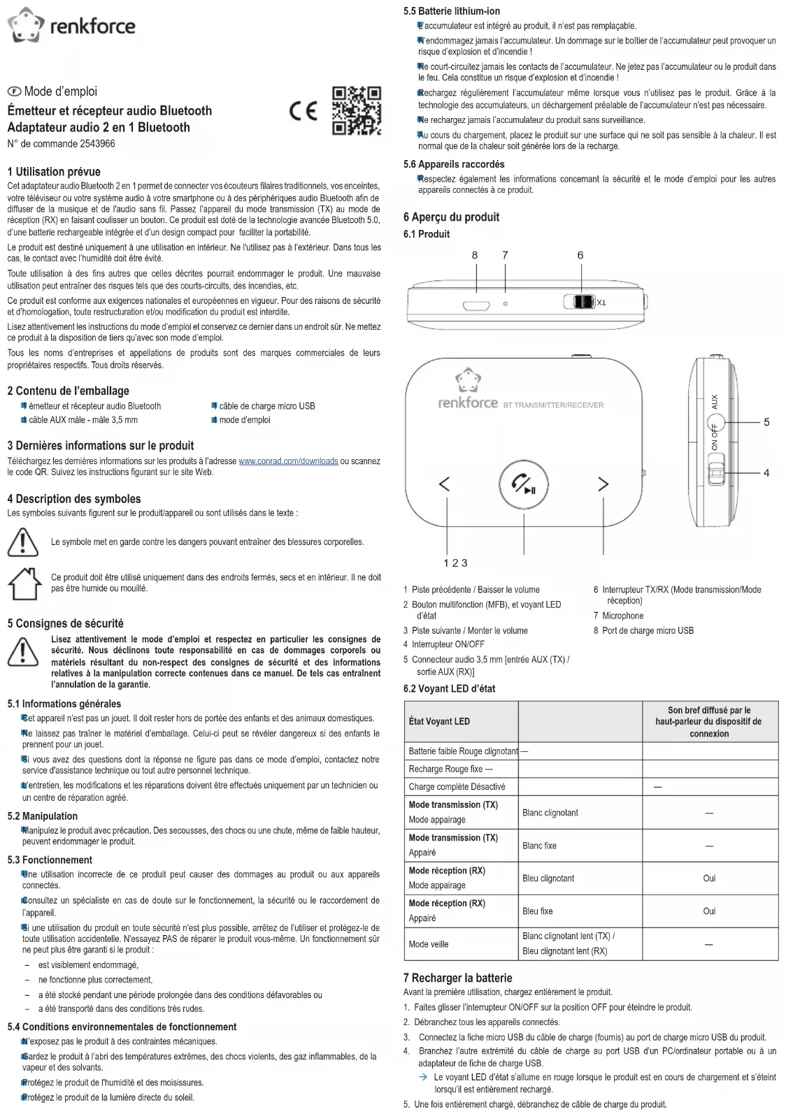 et débranchez le produit du périphérique audio. 10 Guide rapide Fonction Méthode Fonctionnement de base : Mise sous tension Faites glisser l’interrupteur ON/OFF sur « ON ». Mise hors tension Faites glisser l’interrupteur ON/OFF sur « OFF ». Mode transmission Bluetooth (TX) Faites glisser l’interrupteur TX/RX sur « TX ». Mode réception Bluetooth (RX) Faites glisser l’interrupteur TX/RX sur « RX ». MODE TRANSMISSION(TX) Volume – / Volume + Maintenez appuyé sur « < » ou « > » pour régler le volume. Coupez ou rétablir le son du téléviseur Appuyez une fois sur le bouton MFB. MODE RÉCEPTION (RX) Lecture de la musique : Lecture/pause de la musique Appuyez une fois sur le bouton MFB pour écouter, appuyez à nouveau pour mettre en pause. Ignorer la piste précédente / suivante Appuyez une fois sur « < » ou « > ». Volume – / Volume + Maintenez appuyé sur « < » ou « > » pour régler le volume. Gérez les appels : Répondre à un appel entrant Appuyez une fois sur le bouton MFB. Mettre n à un appel Appuyez une fois sur le bouton MFB pendant l’appel. Passer en conversation privée Pendant la conversation téléphonique, appuyez et maintenez enfoncé le bouton MFB pendant 2 secondes pour basculer la conversation sur votre smartphone et continuer en privé. Rejeter un appel entrant Maintenez enfoncé le bouton MFB pendant 2 secondes. Recomposition du dernier numéro Appuyez eux fois sur le boutonMFB pour appeler automatiquement le dernier numéro composé.Ce document est une publication de Conrad Electronic SE, Klaus-Conrad-Strasse 1, D-92240 Hirschau - Allemagne (www. conrad.com). Tous droits réservés y compris la traduction. La reproduction par n'importe quel moyen, p. ex. photocopie, microlm ou saisie dans des systèmes de traitement électronique des données, nécessite l'autorisation préalable par écrit de l'éditeur. La réimpression, même en partie, est interdite. Cette publication représente l'état technique au moment de l'impression. Copyright 2022 by Conrad Electronic SE. *2543966_v1_0622_02_DS_m_4L_(1) 11 Nettoyage et entretien Important : – N’utilisez pas de produits de nettoyage agressifs, de solutions à base d’alcool ou tout autre solvant chimique. Ils peuvent endommager le boîtier et provoquer un dysfonctionnement du produit. – Ne plongez pas le produit dans l’eau. Ne rincez pas le produit sous l’eau du robinet ou ne l’exposez pas à l’humidité.
