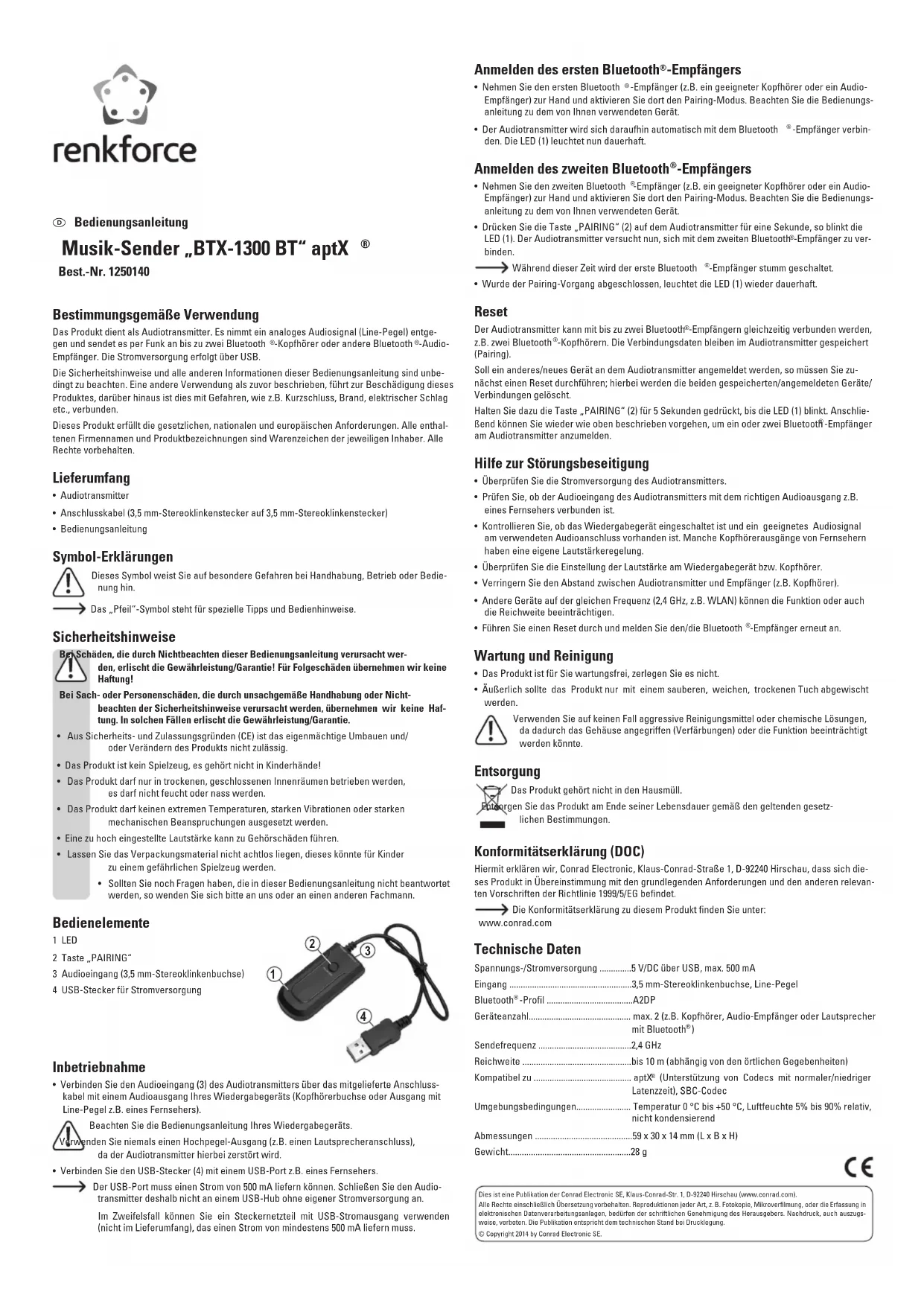- Connectez l’entrée audio (3) du transmetteur audio à une sortie audio de l’appareil de lec-ture (prise casque ou sortie de niveau de ligne p. ex. d’un téléviseur) en utilisant le câble de connexion fourni. Tenez compte du mode d’emploi de votre appareil de lecture. N’utilisez jamais une sortie de haut niveau (p. ex. une borne de haut-parleur) car cela endommagerait irréversiblement le transmetteur audio.• Branchez le connecteur USB (4) avec un port USB p. ex. d’un téléviseur. Le port USB doit pouvoir fournir un courant de 500 mA. Par conséquent, ne branchez pas le transmetteur audio à un concentrateur USB qui ne dispose pas de son propre bloc d’alimentation. En cas de doute, vous pouvez utiliser un bloc d’alimentation avec une sortie de courant USB (non inclus dans l’étendue de la livraison), qui doit délivrer un courant d’au moins 500 mA. Ceci est une publication de Conrad Electronic SE, Klaus-Conrad-Str. 1, D-92240 Hirschau (www.conrad.com). Tous droits réservés, y compris de traduction. Toute reproduction, quelle qu‘elle soit (p. ex. photocopie, microfilm, saisie dans des installations de traitement de données) nécessite une autorisation écrite de l‘éditeur. Il est interdit de le réimprimer, même par extraits. Cette publication correspond au niveau technique du moment de la mise sous presse. © Copyright 2014 by Conrad Electronic SE.Aanmelden van de eerste Bluetooth